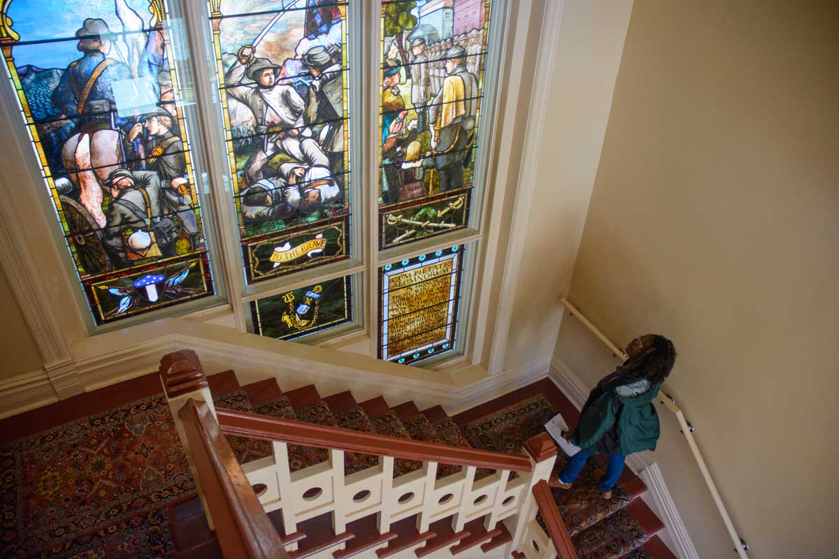 Doctoral student Andrew Marion, who has been hired by the Slavery Research Group to do research with fellow student Chet Bush, led the tour. The first stop on the tour was the Lyceum.