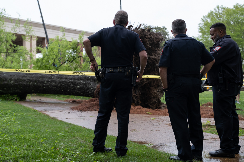 On Wednesday, April 10, at least two other trees fell – one in the Grove and one Carrier House, the chancellor’s residence. On April 11, a tree near the Lyceum split causing part of it to collapse.
