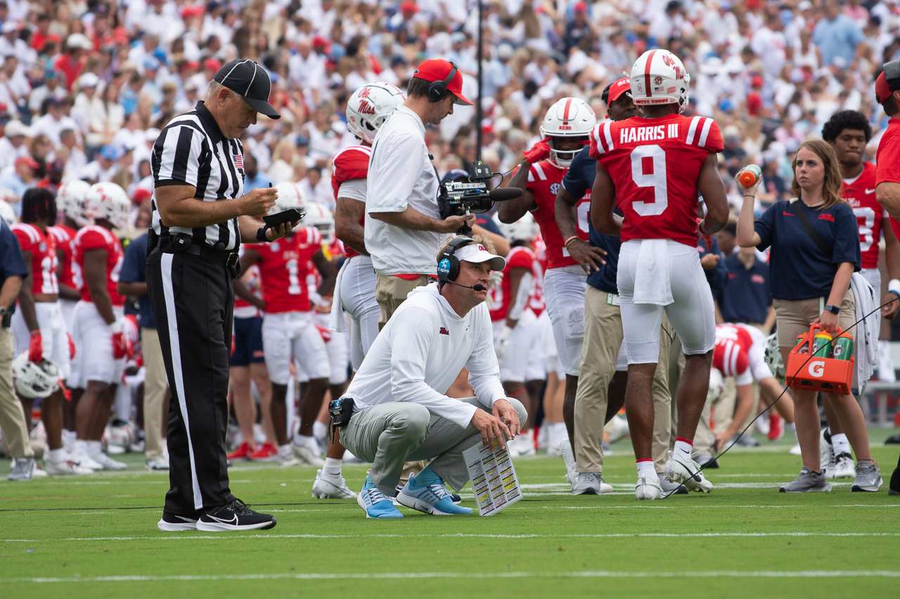 Lane Kiffin watches a replay during a game against Mercer in Vaught-Hemingway Stadium on Sep 3, 2023. Photo by John Matthews