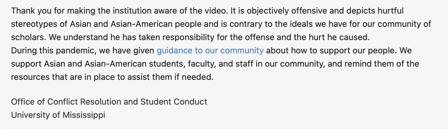 “As an Asian American myself, it shocks and hurts me to see that a racist like Silas James will be calling himself an Ole Miss student,” one Asian American student, who asked for her name to not be used for fear of backlash, said in an email to the Office of Student Conduct on Monday.