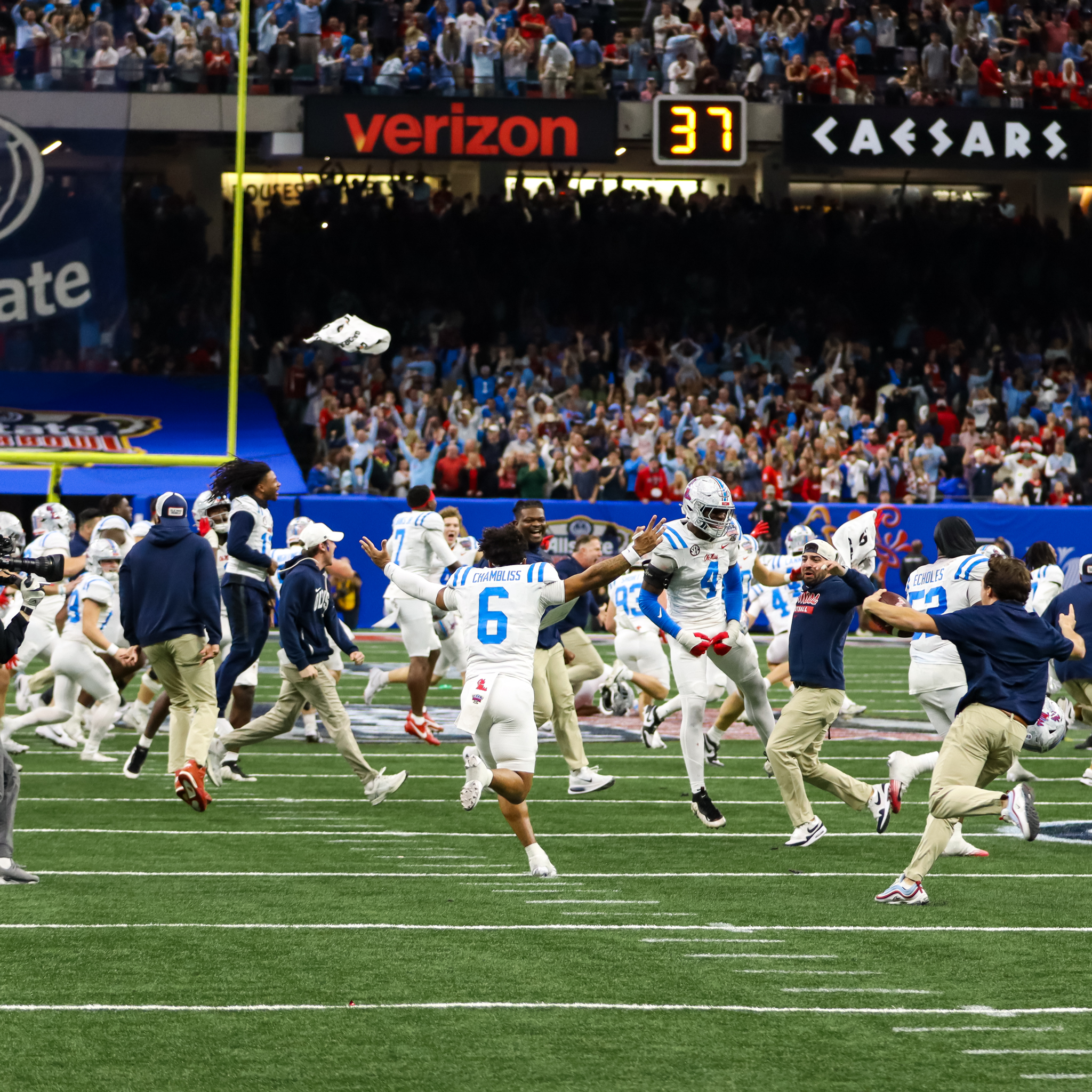 Trinidad Chambliss celebrates on the field at the Caesars Superdome on Jan. 1. Photo by Will Wright