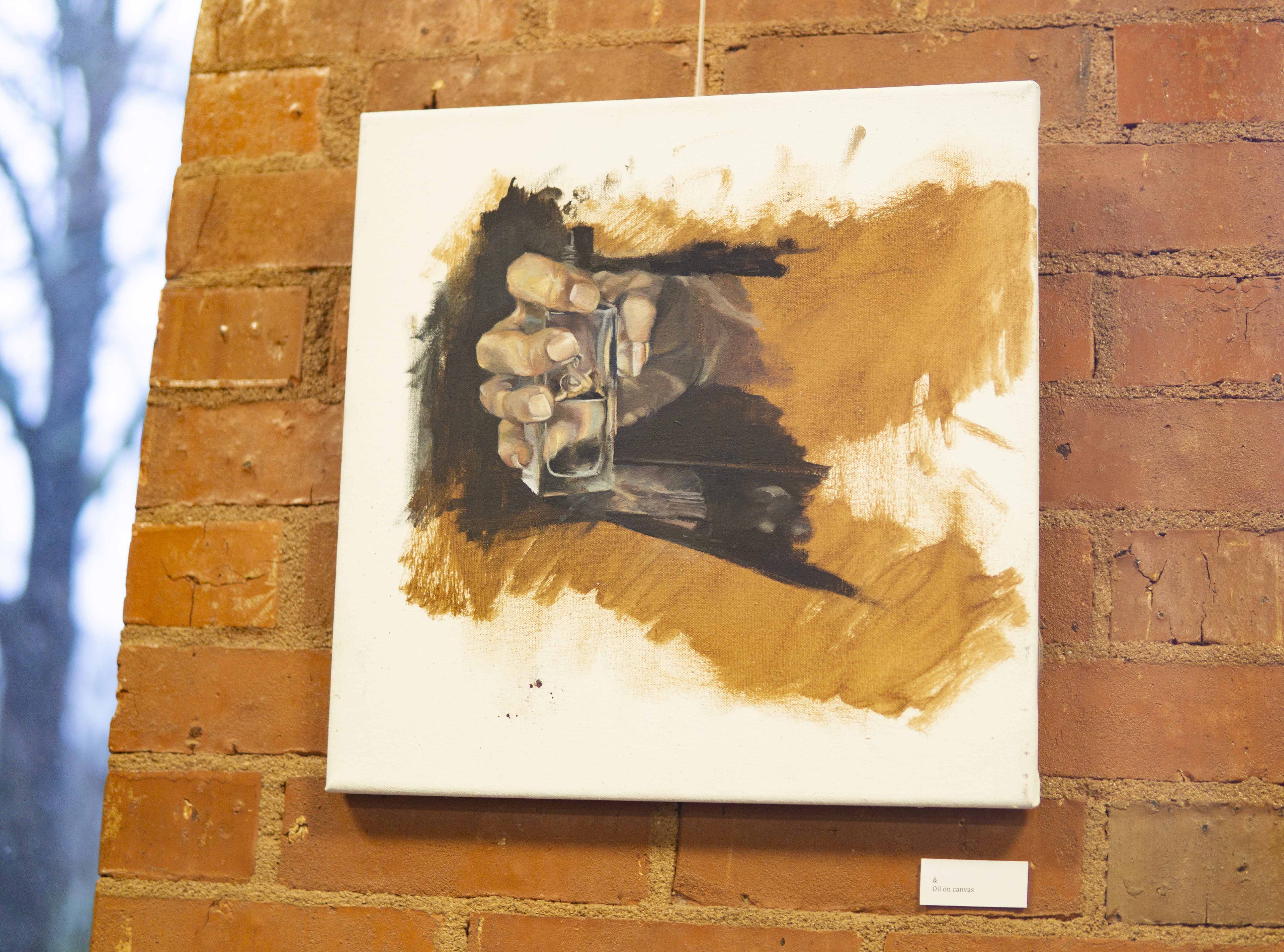 There is an uncertainty to the details of background and foreground — leaving the lives of the subjects a blur. The colors of the paintings are particularly striking. The muted, dark tones Alexander chooses prove a stark contrast to the red brick walls of the room.