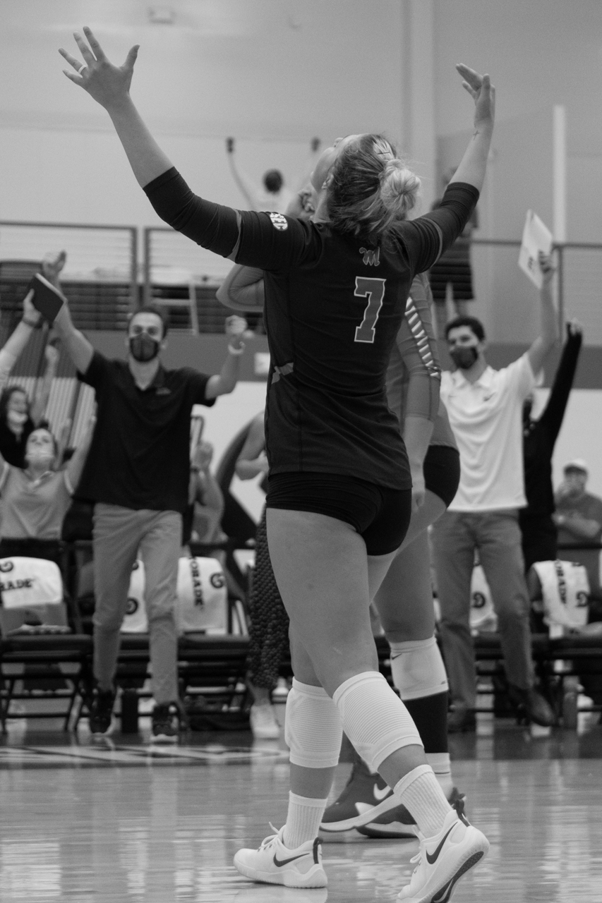 Sam Burgio celebrates after the Rebels score a point. Photo by HG Biggs.