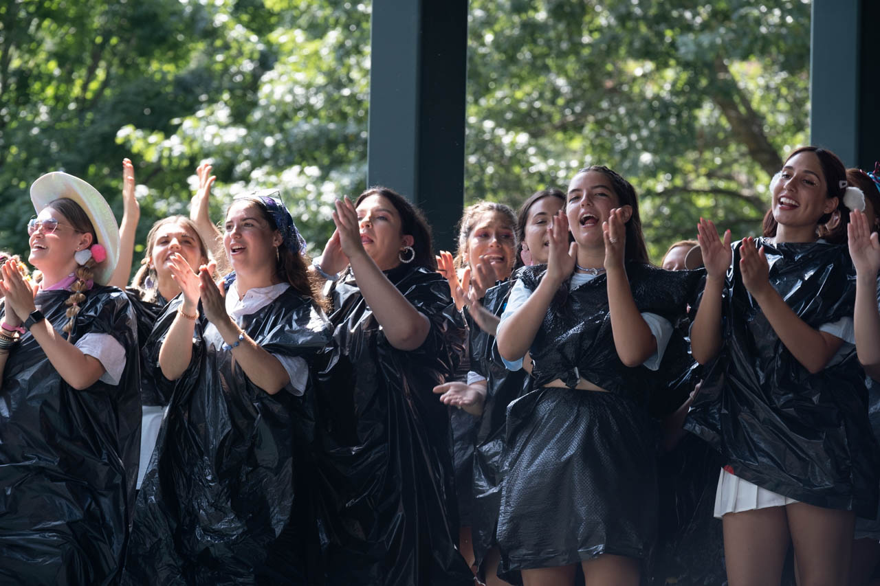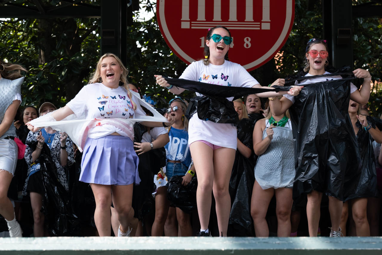 Recruitment counselors from the Tri Delta sorority dance and chant on the stage in the Grove. Photo by HG Biggs.