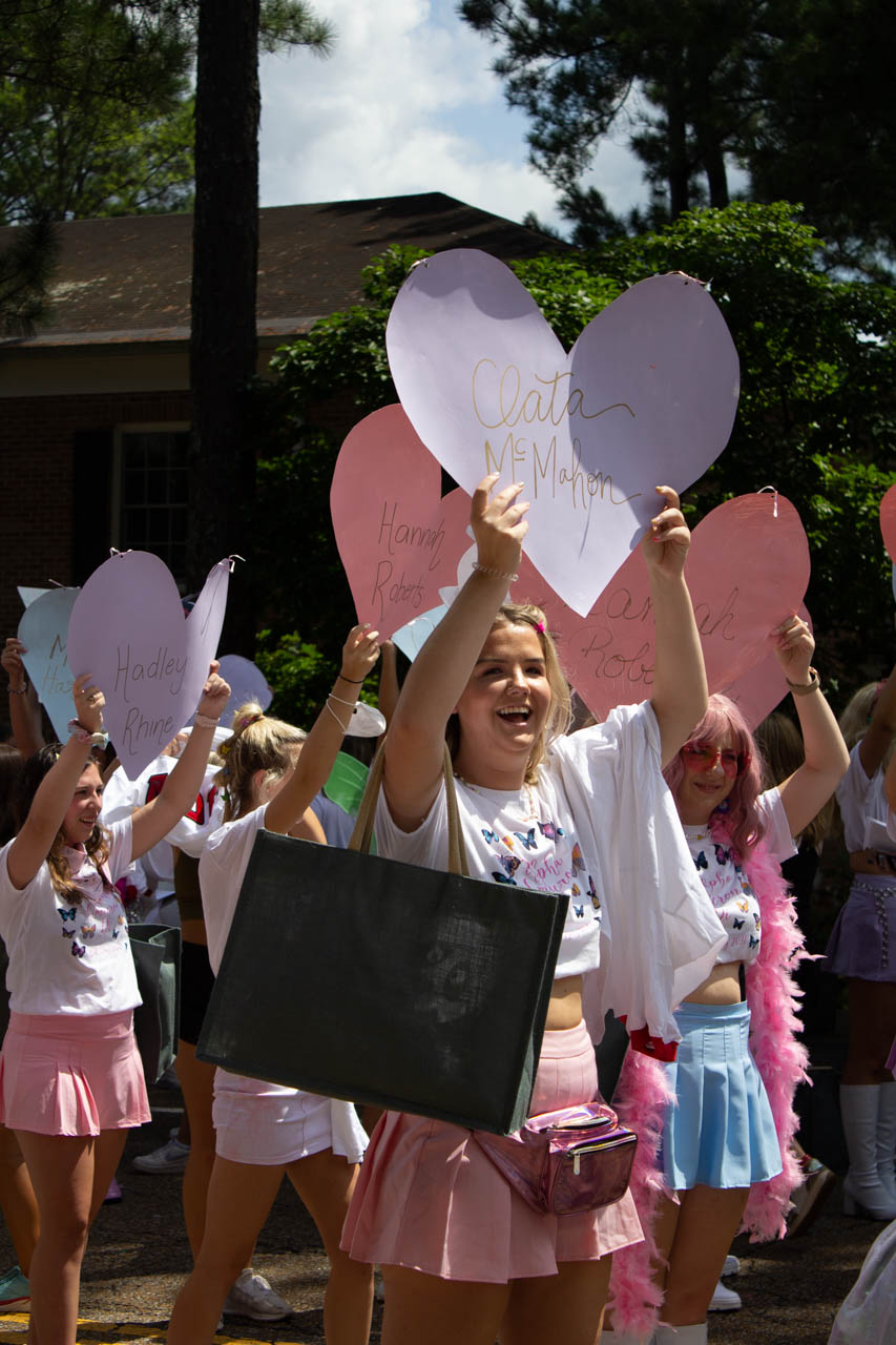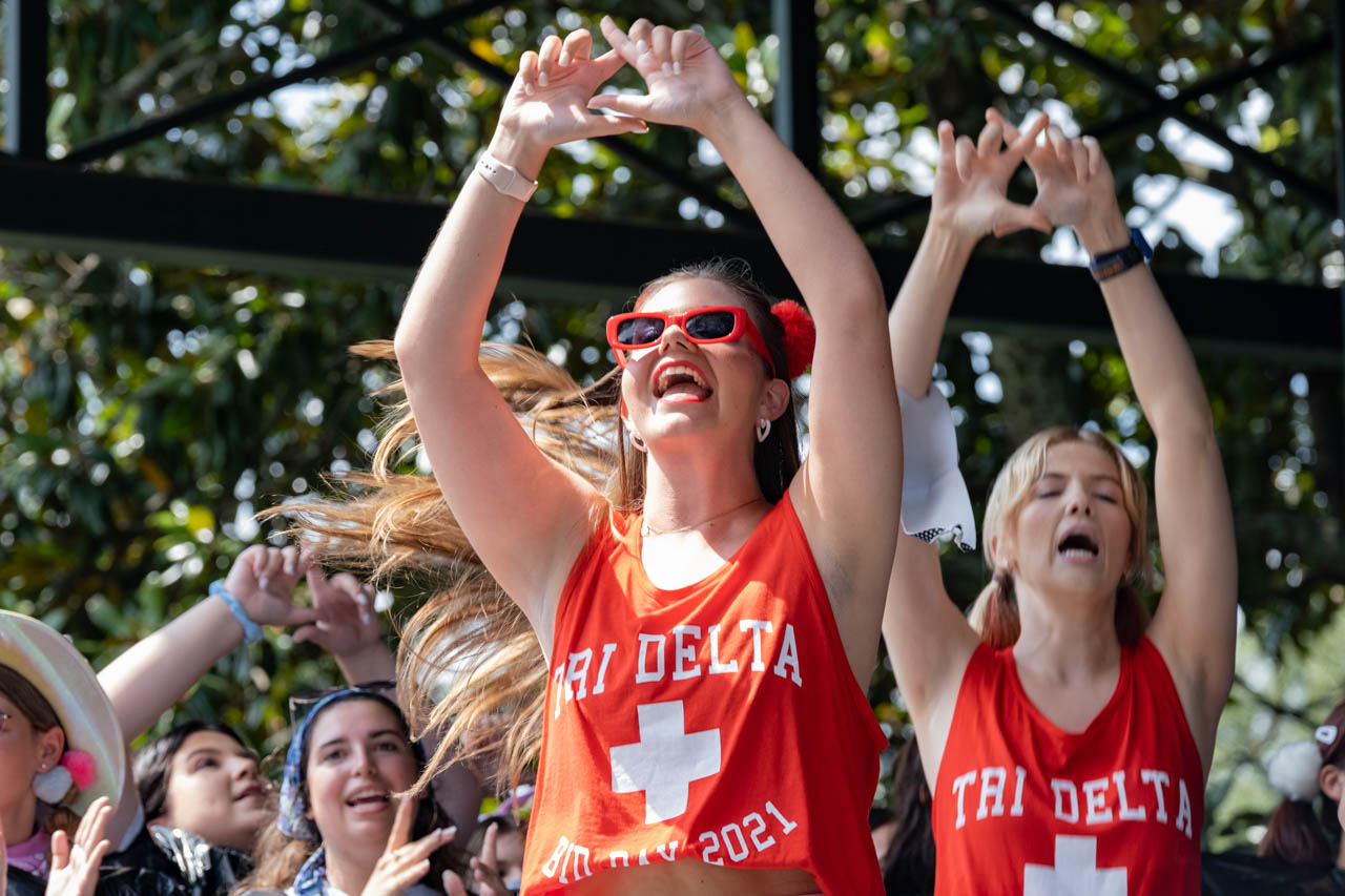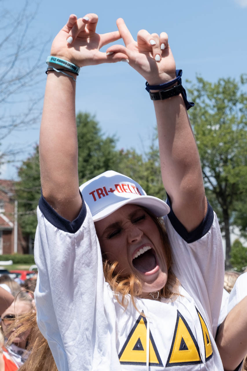 A new Tri Delta member cheers on sorority row. Photo by HG Biggs.