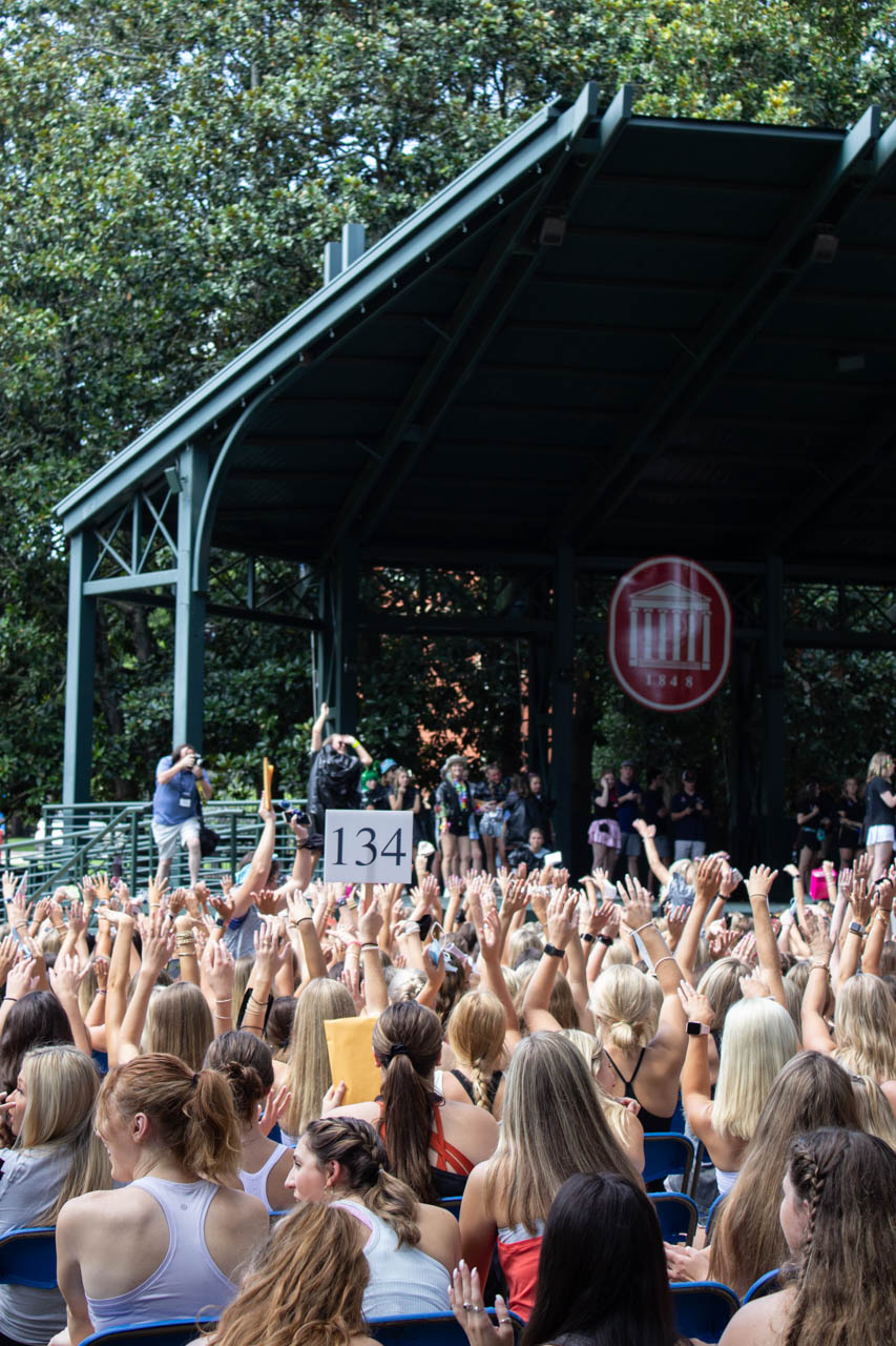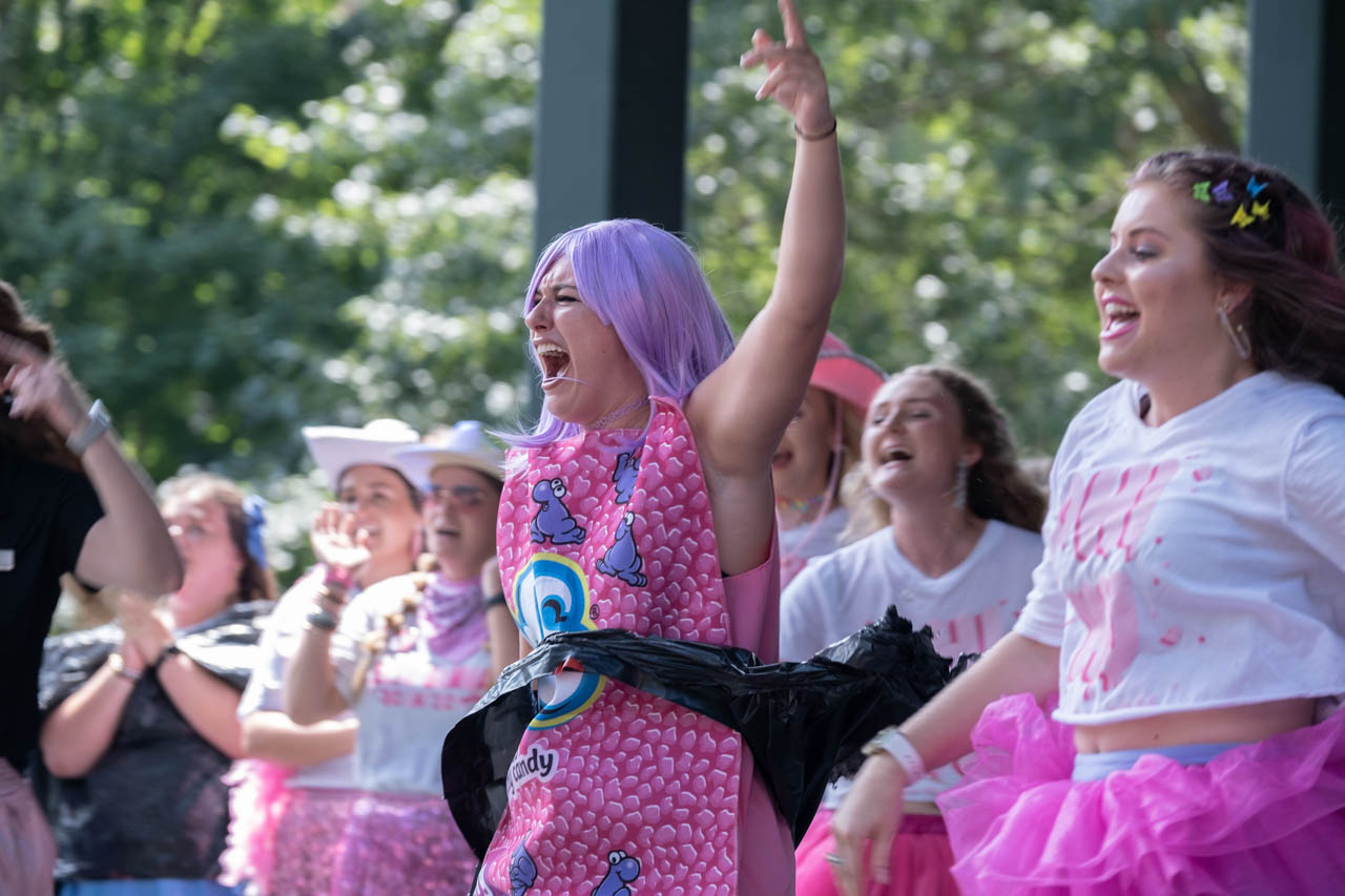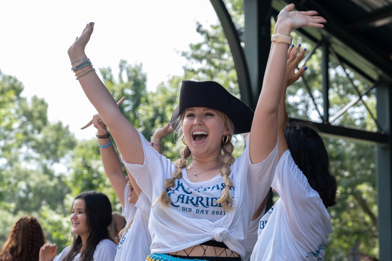 A Phi Mu recruitment counselor cheers on the stage in the Grove. Photo by HG Biggs.