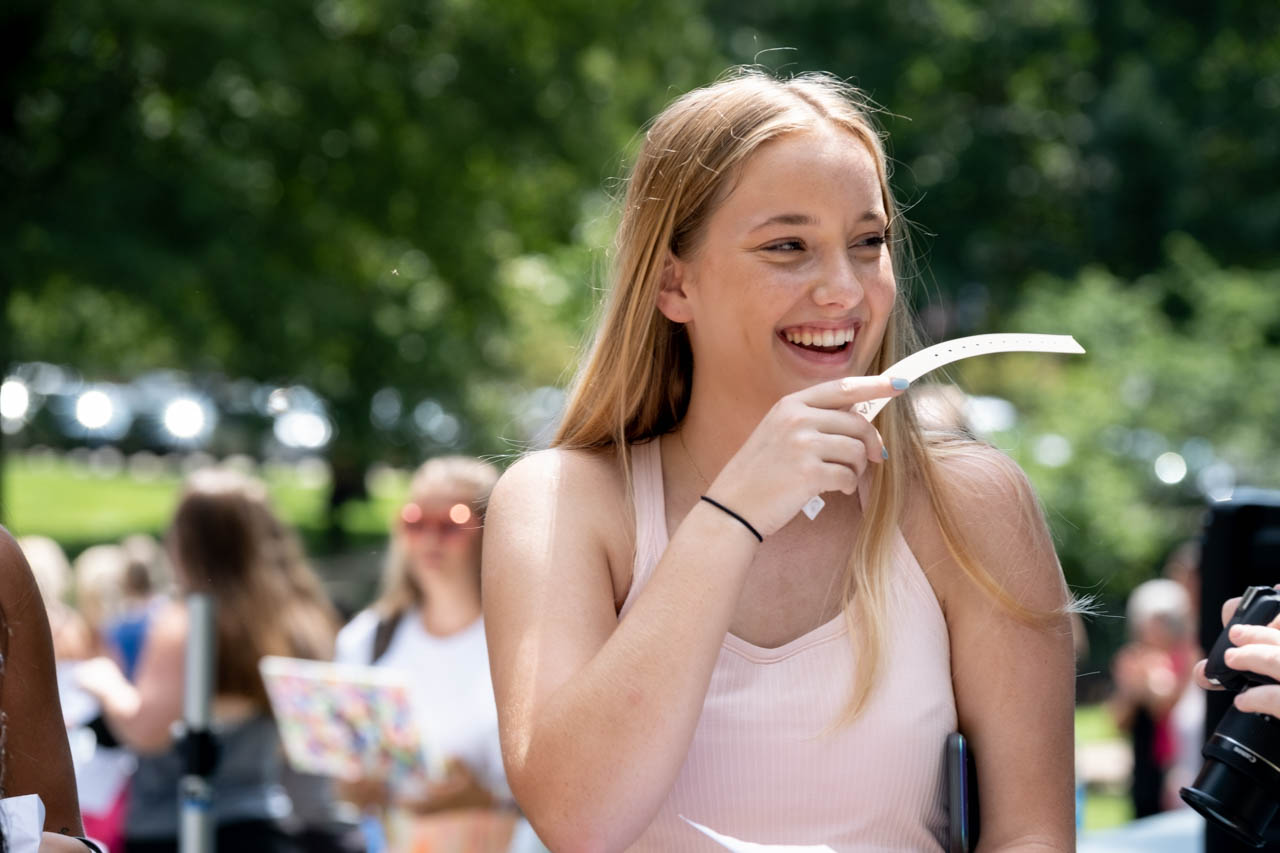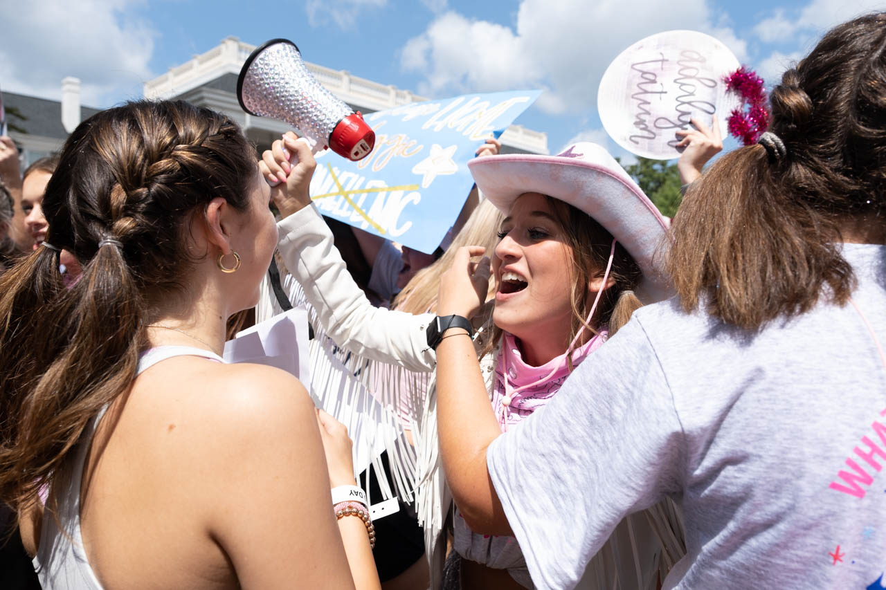 Delta Gamma rush chair Ellie Buell shouts as the new members run down sorority row. Photo by HG Biggs.