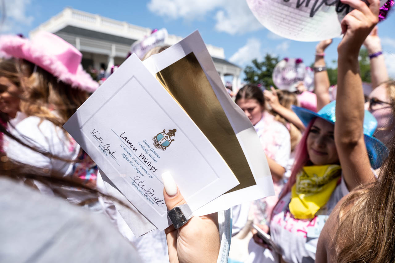 Lauren Phillips holds her bid from Delta Gamma. Photo by HG Biggs.