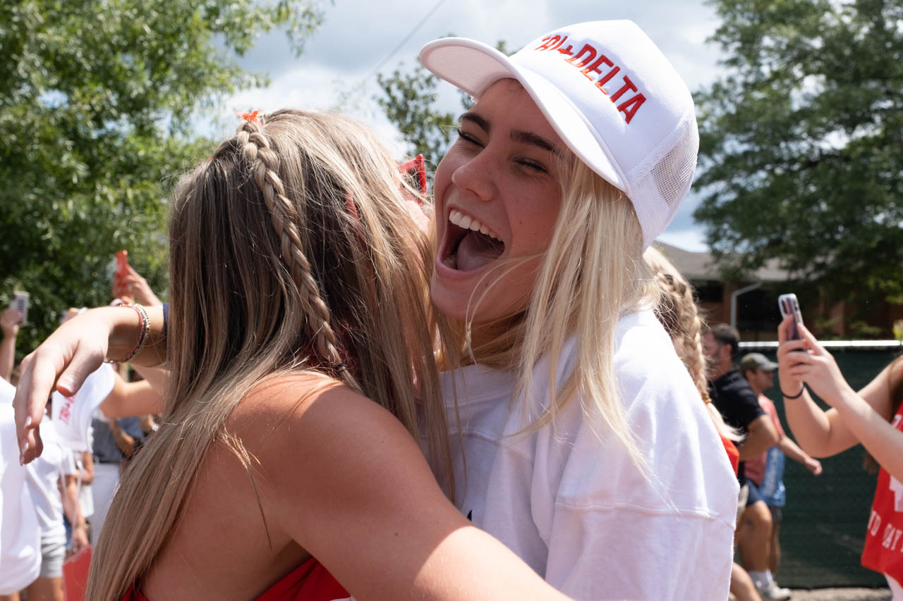 A new member of Tri Delta hugs one of her new sisters. Photo by HG Biggs.