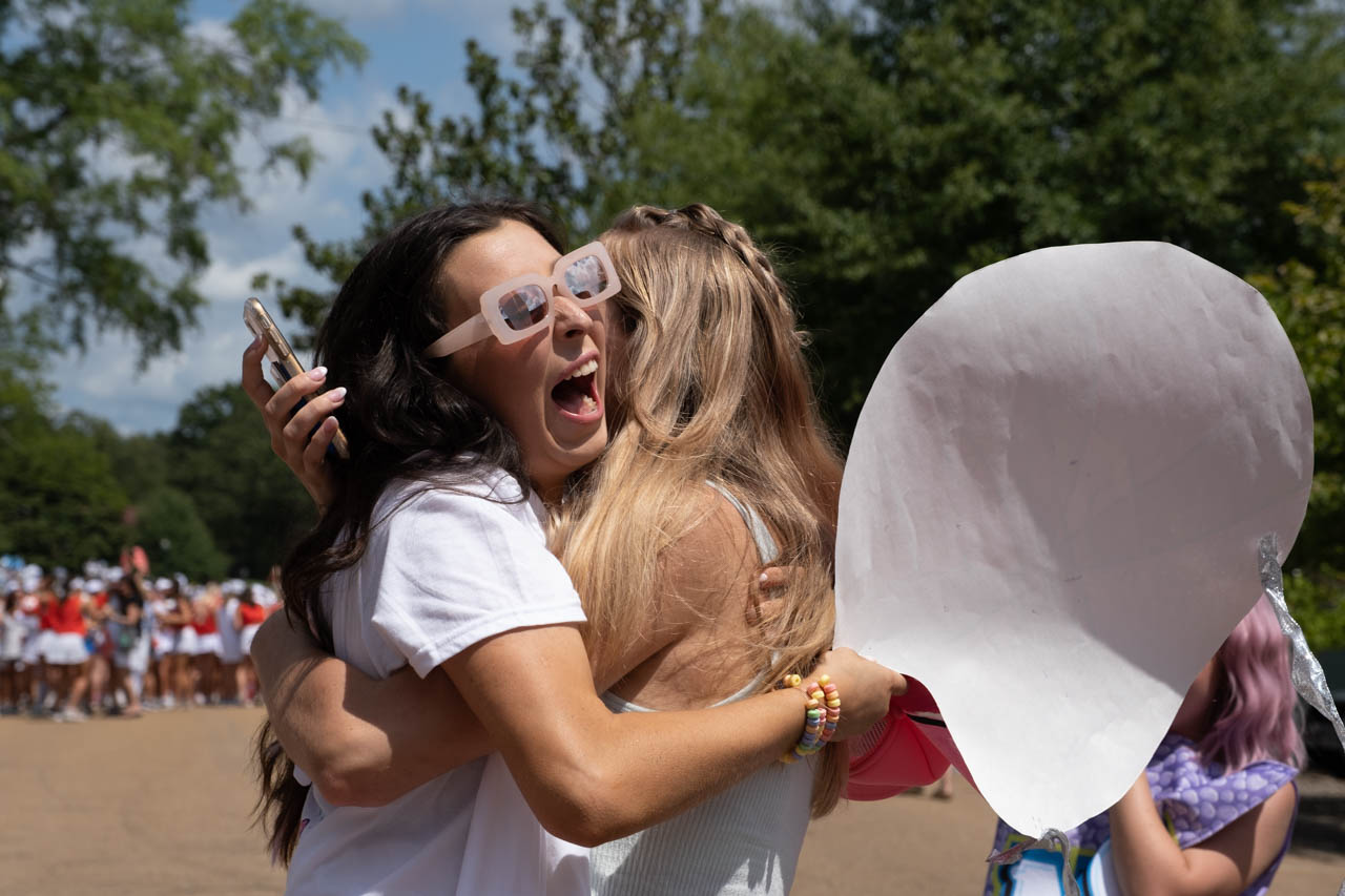 A new member of Phi Mu is welcomed by her bid day buddy. Photo by HG Biggs.