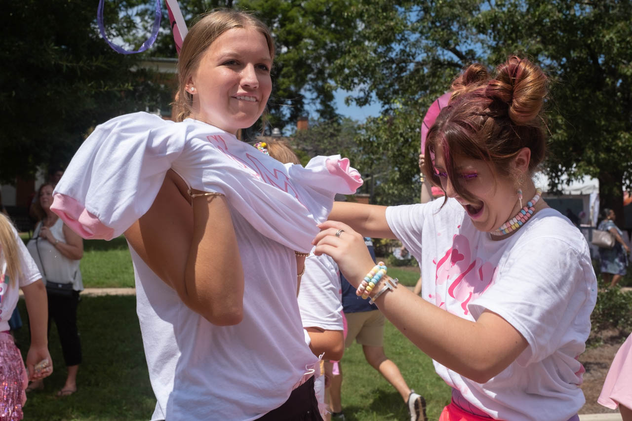 A new member of the Phi Mu sorority dons a t-shirt with the help of her bid day buddy. Photo by HG Biggs.