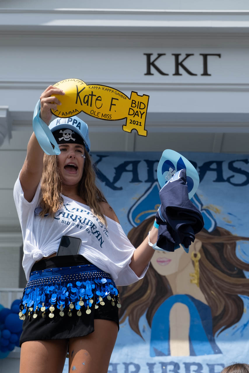 A member of the Kappa Kappa Gamma sorority looks for her bid day buddy. Photo by HG Biggs.