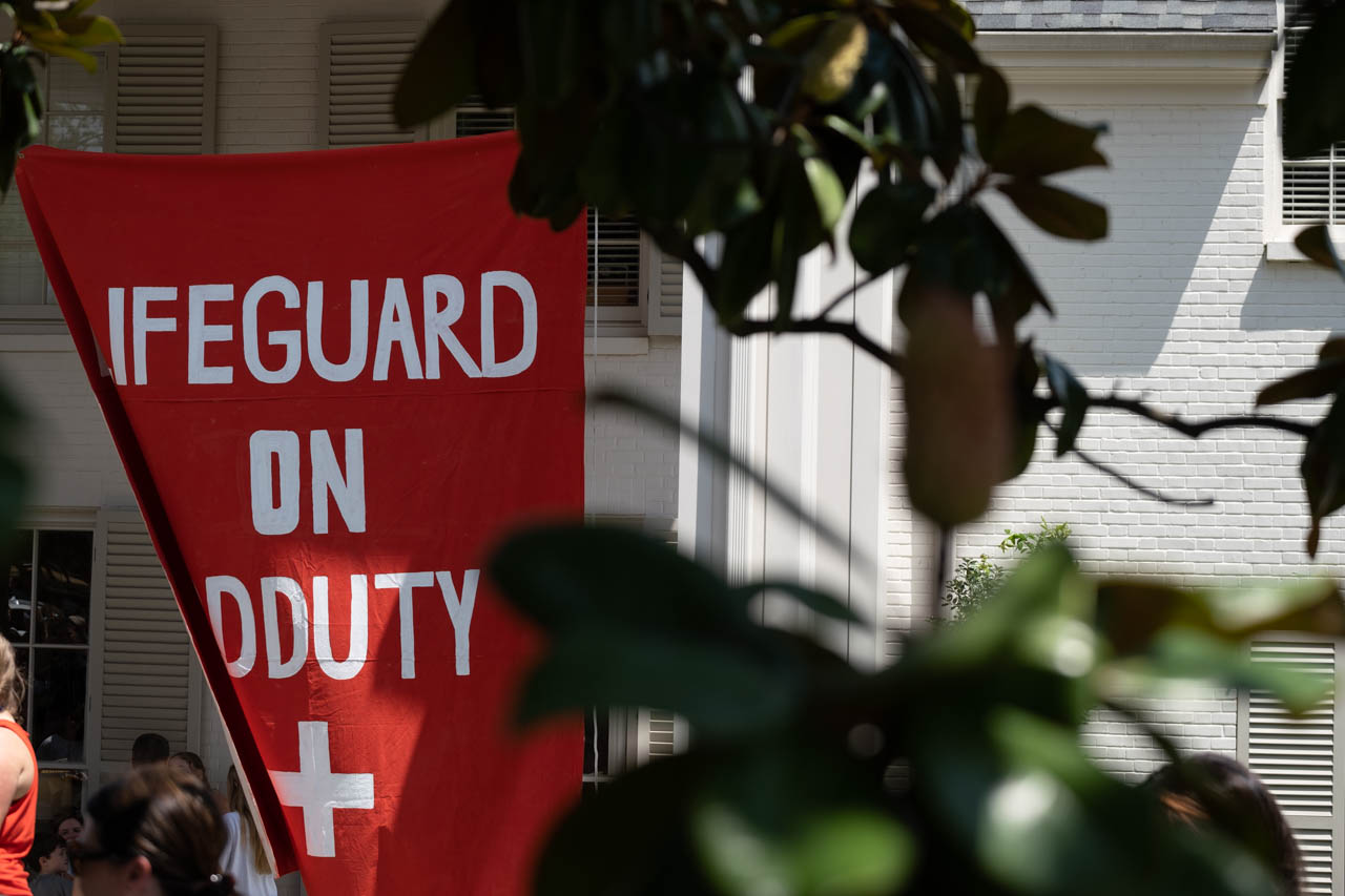 A sign reading "Lifeguard on DDDuty" hangs from the Tri Delta house. Photo by HG Biggs.