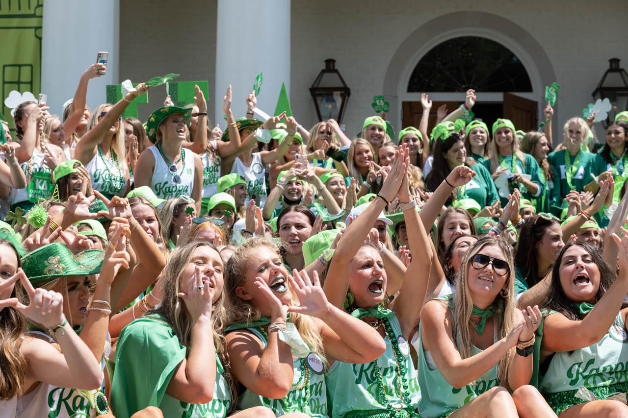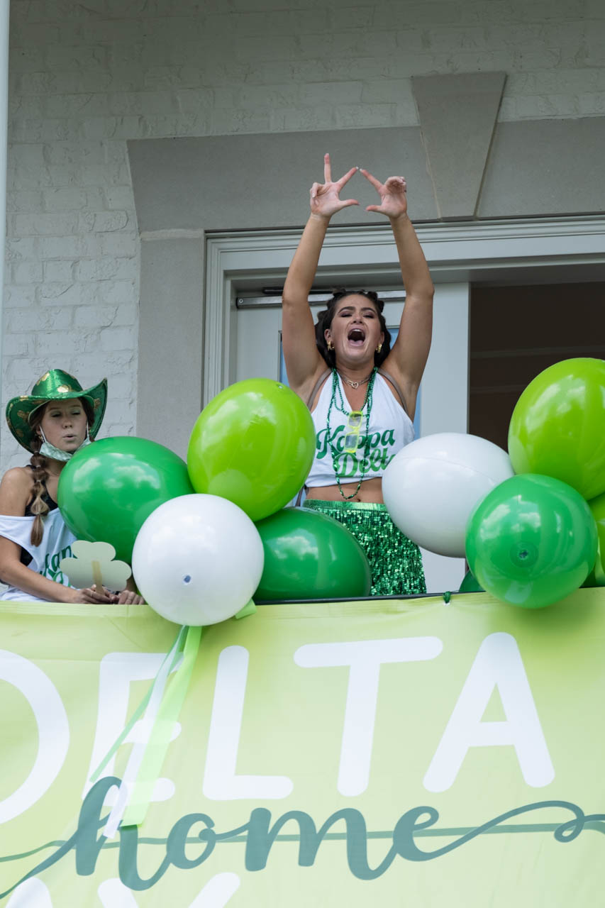 Kappa Delta sisters chant and cheer outside of their sorority house. Photo by HG Biggs.