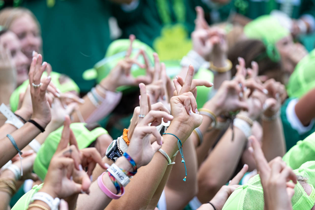 Kappa Delta sorority sisters hold up their hand signs. Photo by HG Biggs.