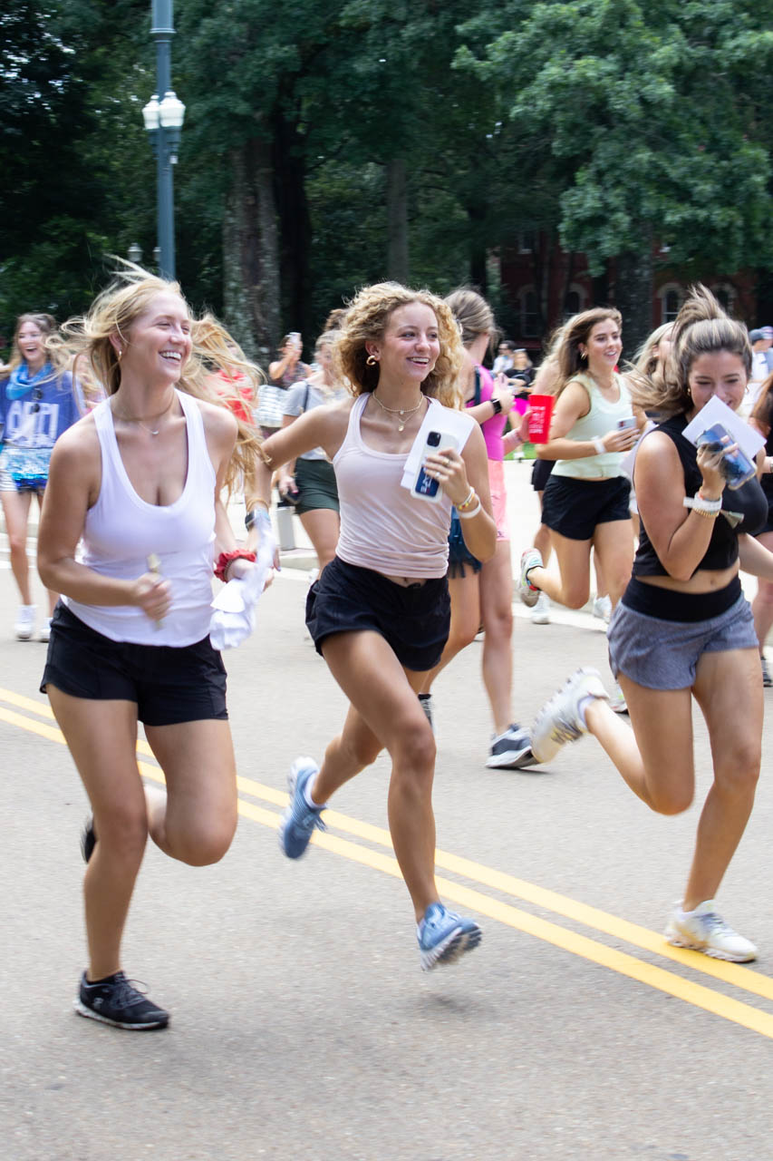 After receiving their bids, the new members run past the student union to the houses on Rebel Drive. Photo by Jess Cooley.