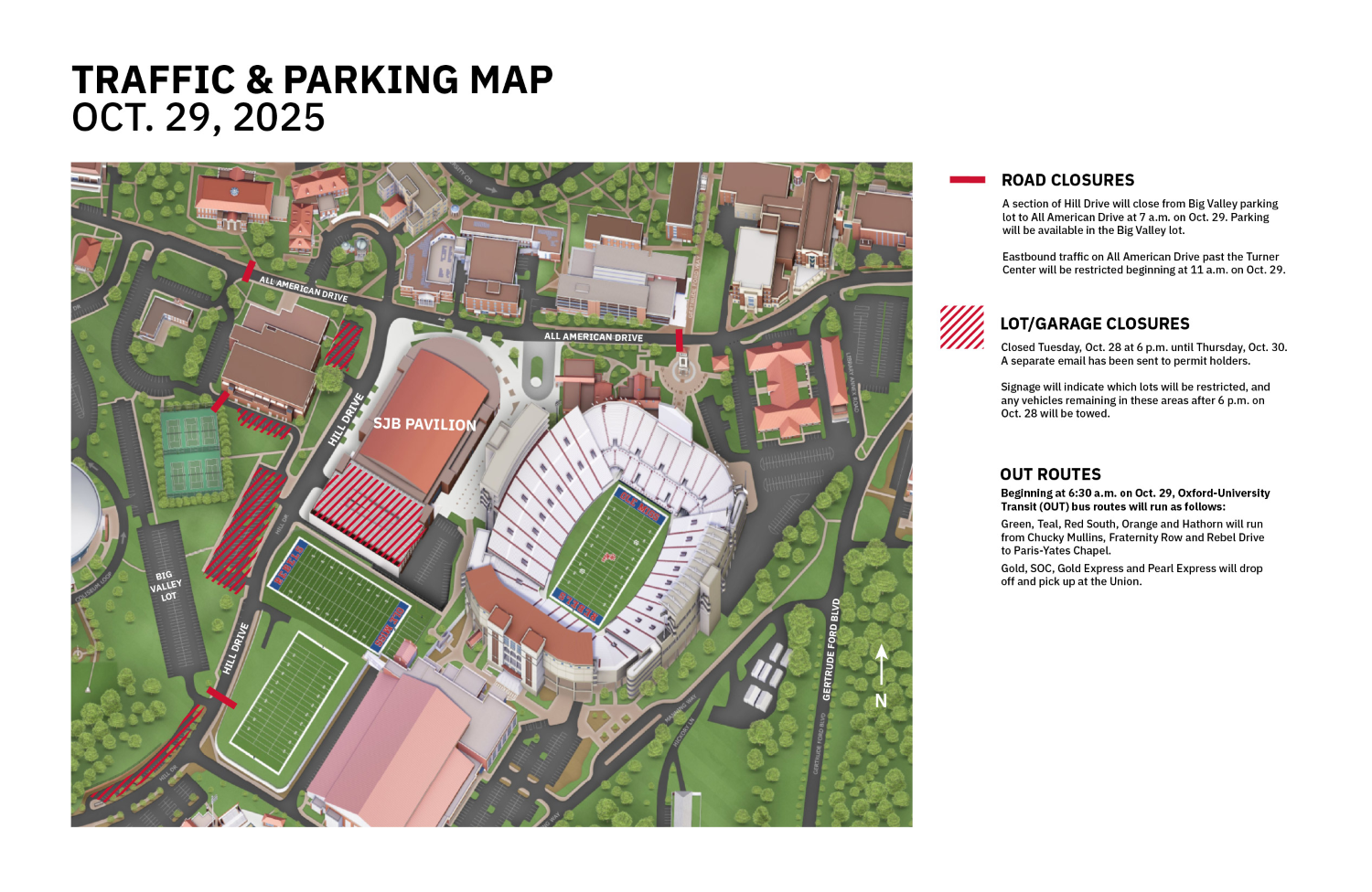 Oxford-University Transit lines will also be affected. The Green, Teal, Red South, Orange and Hathorn lines will run from Chucky Mullins Drive, Fraternity Row and Rebel Drive to Paris-Yates Chapel, while the Gold, SOC, Gold Express and Pearl Express lines will drop-off and pick-up from the student union.