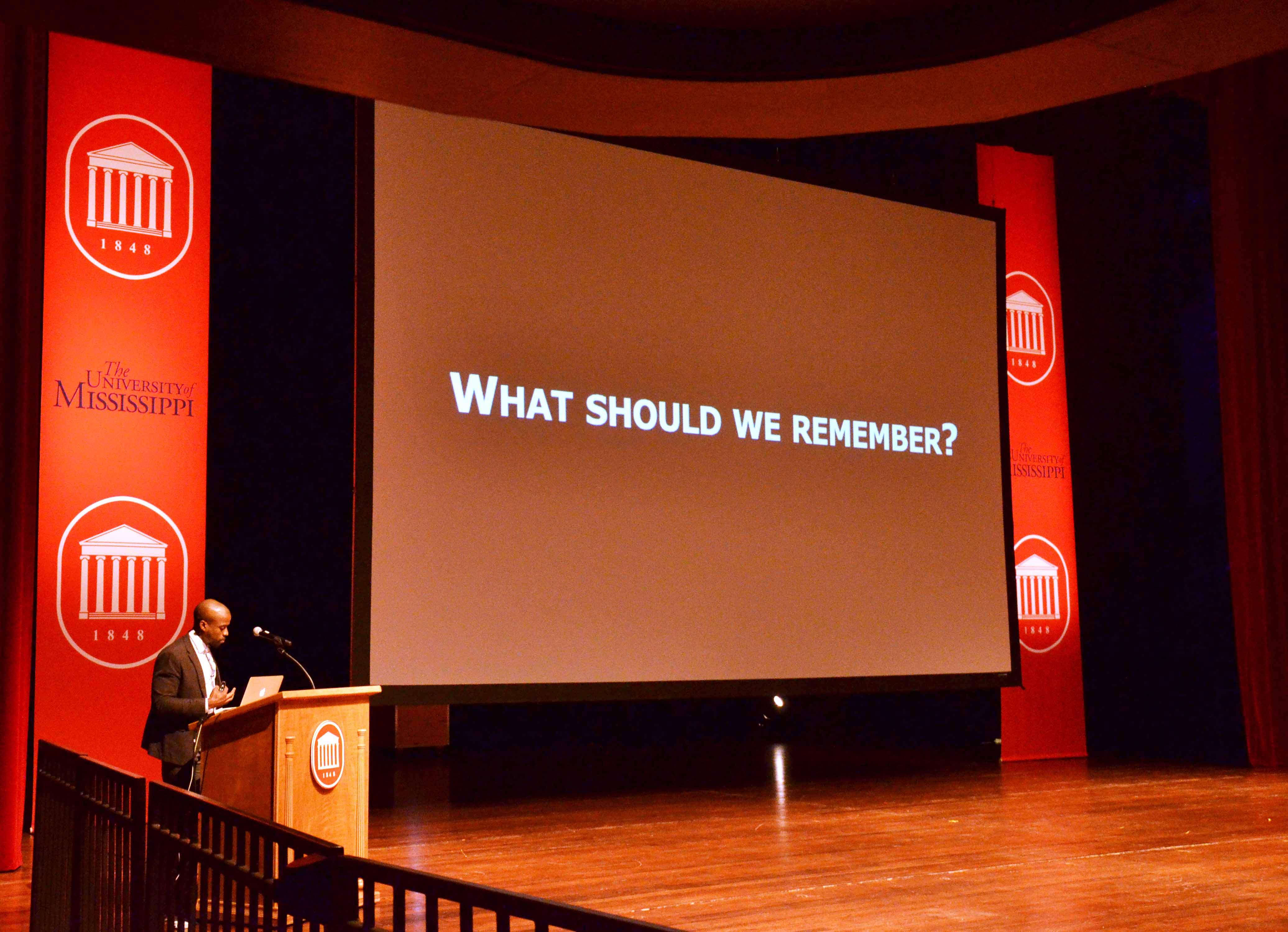 Foster, a university Southern studies and sociology professor who graduated from the Sally McDonnell Barksdale Honors College in 2011, served as keynote speaker for the Honors College spring convocation last night at the Gertrude C. Ford Center. He asked students to think deeply about their memories, and his Jukebox-themed speech followed his doctoral and current research on the Mississippi Delta.