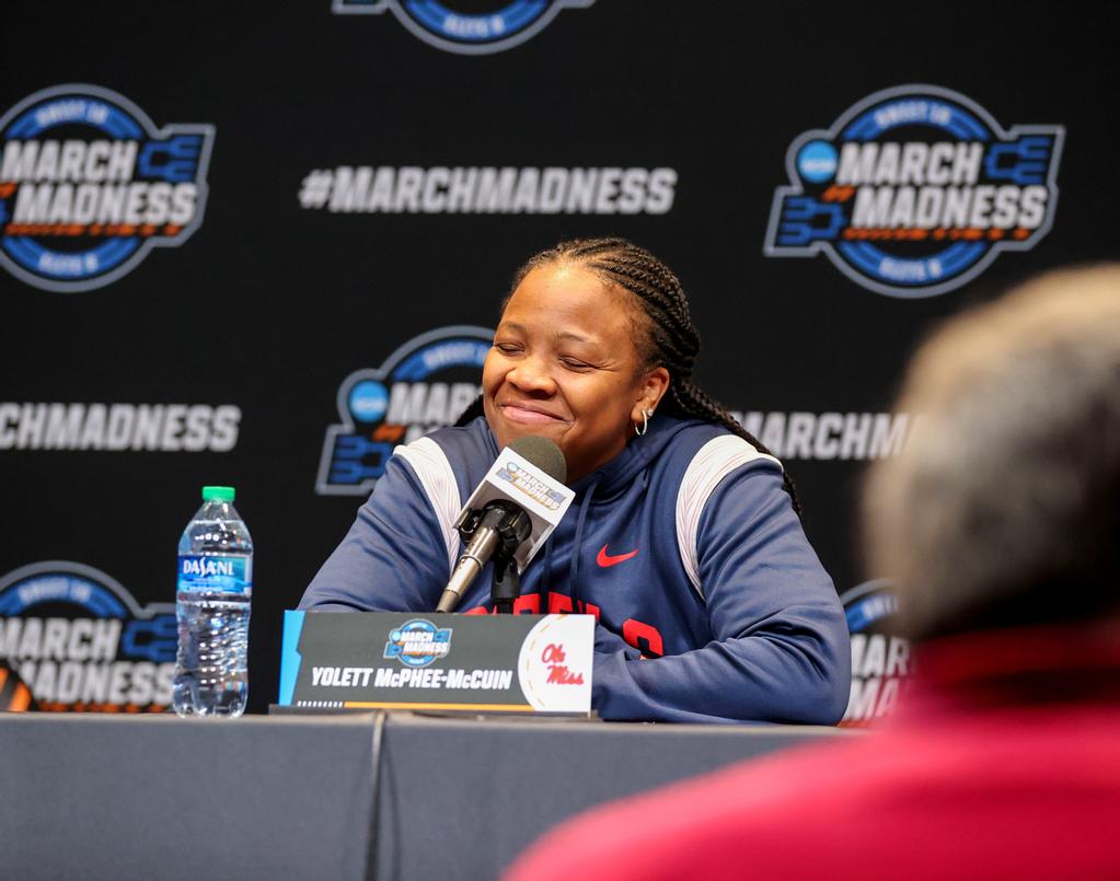 Ole Miss women’s basketball head coach Yolett McPhee-McCuin speaks at a press conference on March 23, 2023, prior to Ole Miss’s sweet 16 game against Louisville.
