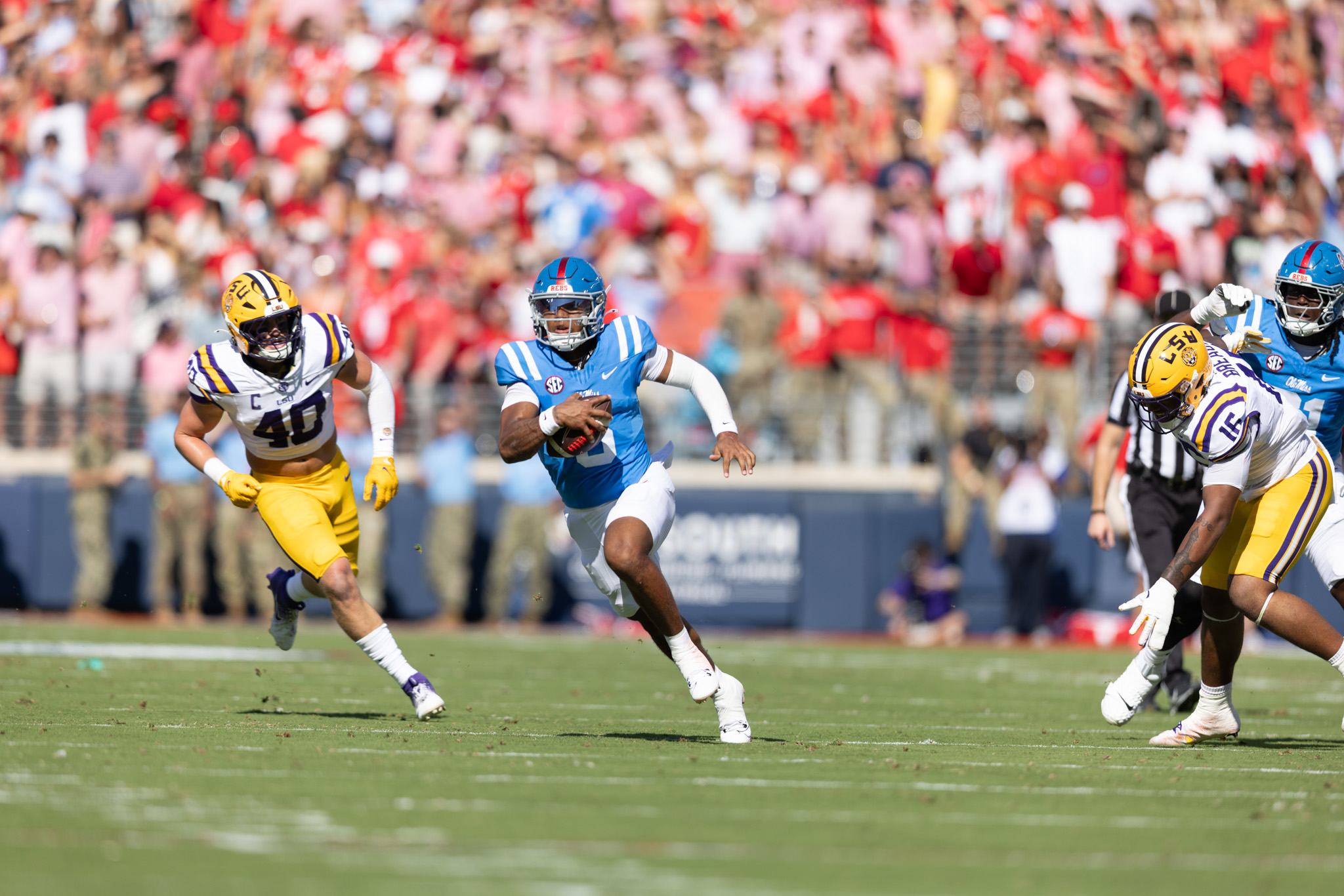 Trinidad Chambliss running the ball during the game against LSU in Vaught-Hemingway Stadium on Sept. 27. Photo by Ford Benton
