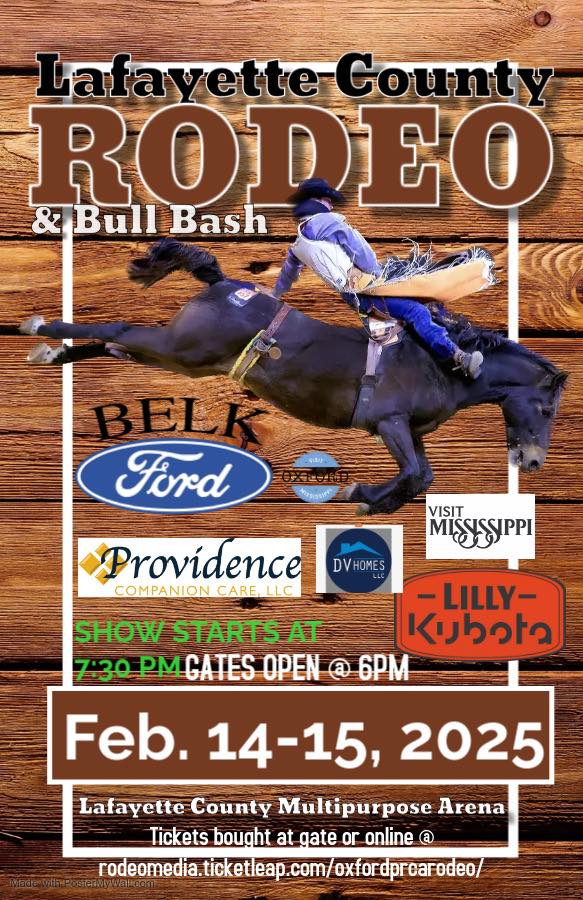 The Lafayette County PRCA Rodeo and Bull Bash is scheduled to come to Oxford on Feb. 14-15. Gates for both shows open at 6 p.m., and the shows start at 7:30 p.m. The rodeo will be located at the Lafayette County Multipurpose Arena, and tickets can be purchased at the gate.