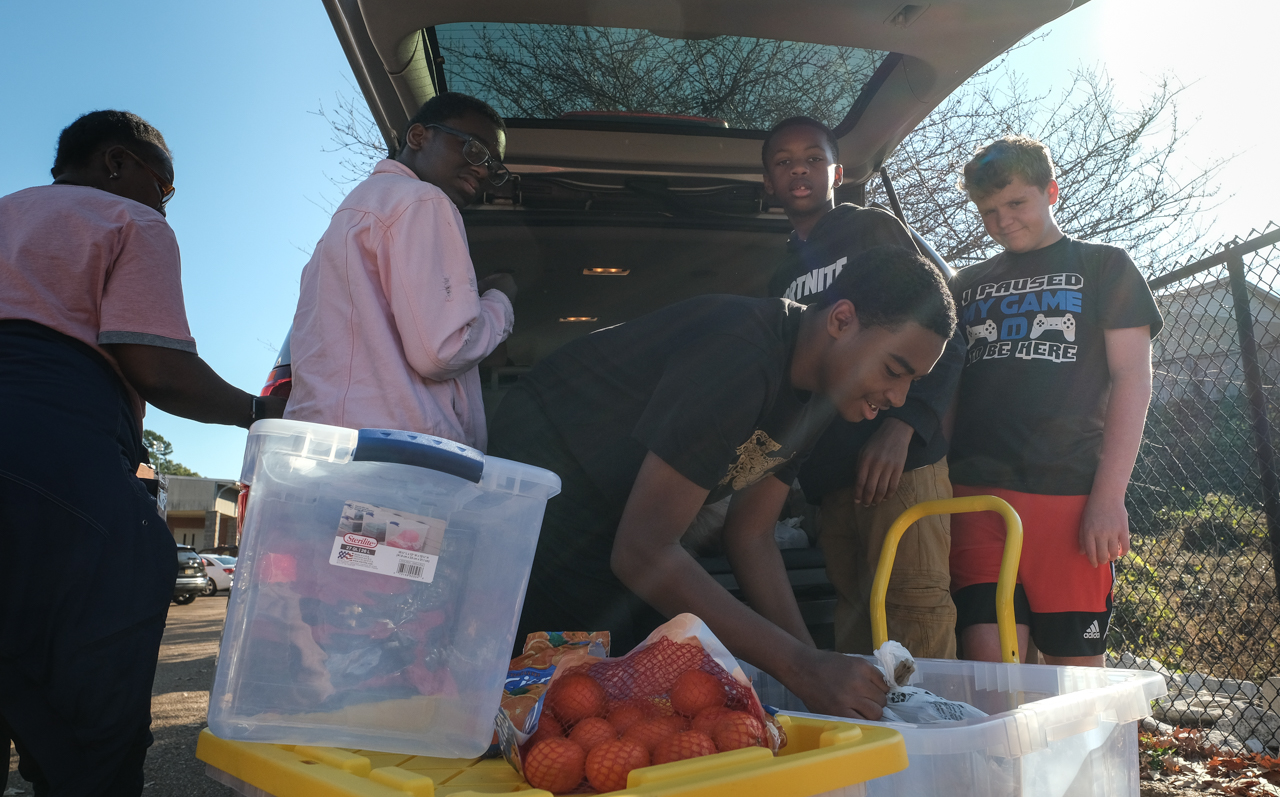 Priscilla Gillon-Fischer, Zamarion Gilliom, Daniel Buford, Dontrell Frazier and Austin Williams help load a car with Love Packs to be distributed to other Oxford schools on the morning of Nov. 9. Photo by HG Biggs.