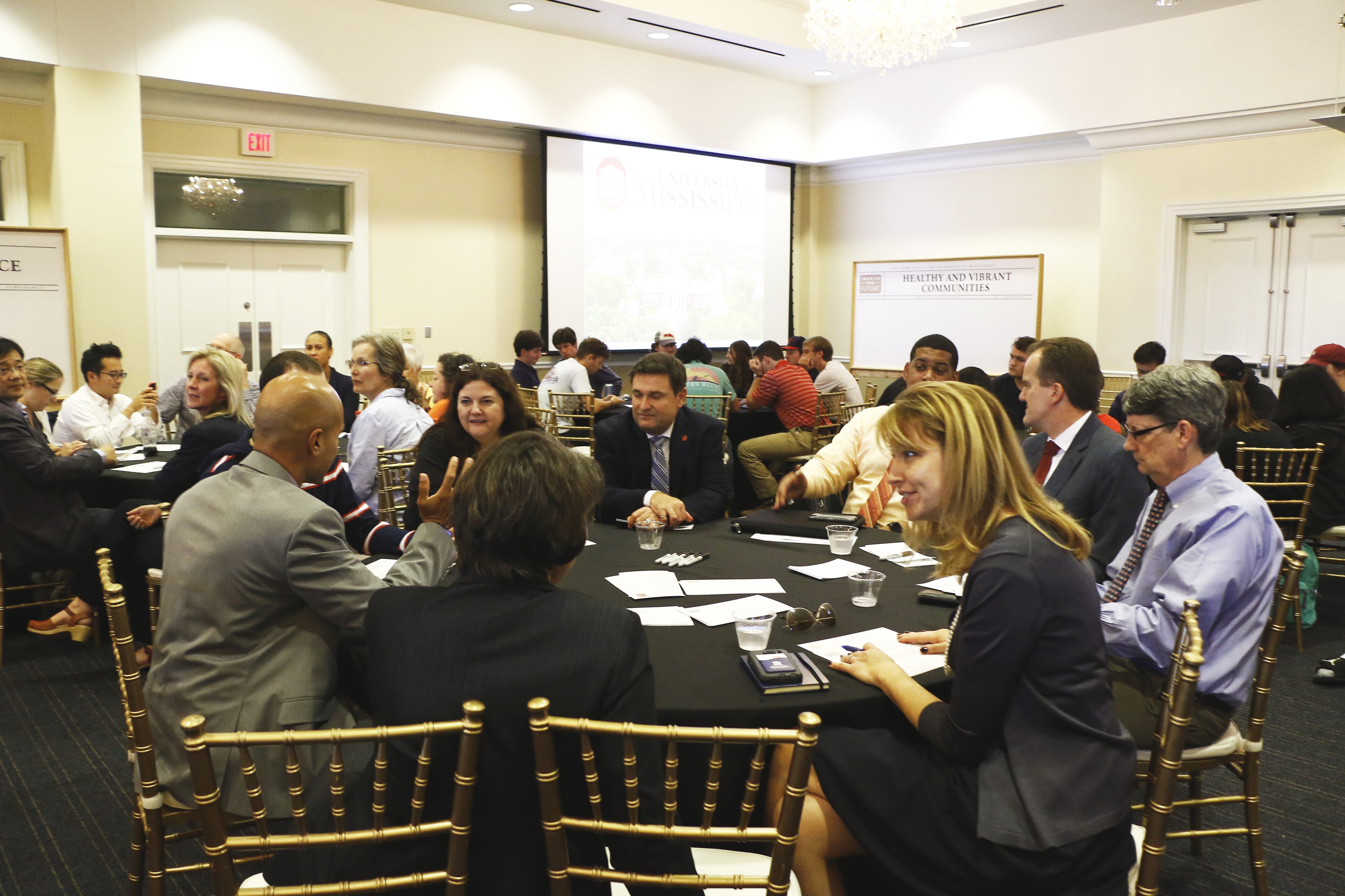 Members of the Lafayette County, Oxford and Ole Miss community filled the Gertrude C. Ford Ballroom at The Inn at Ole Miss on Wednesday afternoon to hear Chancellor Jeffrey Vitter give his “State of the U” speech at the university’s second annual town hall meeting. Vitter outlined his vision for the university by using four pillars: academic excellence; healthy and vibrant communities; people, places and resources; and athletic excellence.