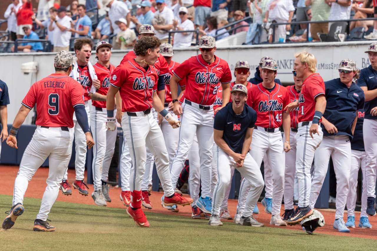 Ole Miss Baseball celebrates in game three against LSU at Swayze Field on April 12. Photo by Madison Twiddy