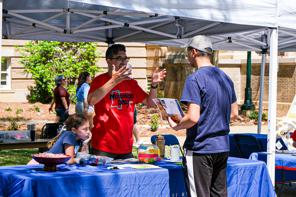 Morris manned the Speaking Center tent at Mississippi Day along with junior pharmacy major Ray Goodwin, who talked about what the tent had to offer to visitors.