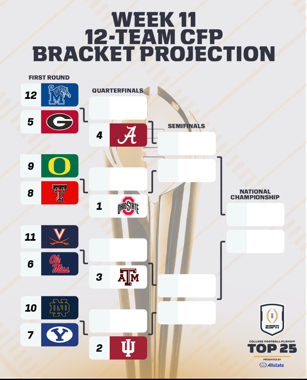 Ohio State, Indiana, Texas A&M and Alabama were the Top 4 seeds. No. 11 Texas and No. 12 Oklahoma were the first teams out of the playoffs, bumped out by Virginia (projected ACC champion) and Memphis (top Group of 5 team), who currently is not ranked in the Top 25.