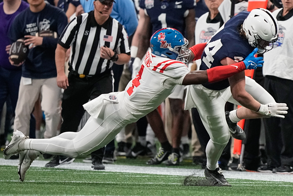 Penn State tight end Tyler Warren (44) runs against Mississippi linebacker Suntarine Perkins (4) during the first half of the Peach Bowl NCAA college football game, Saturday, Dec. 30, 2023, in Atlanta. (AP Photo/Brynn Anderson)