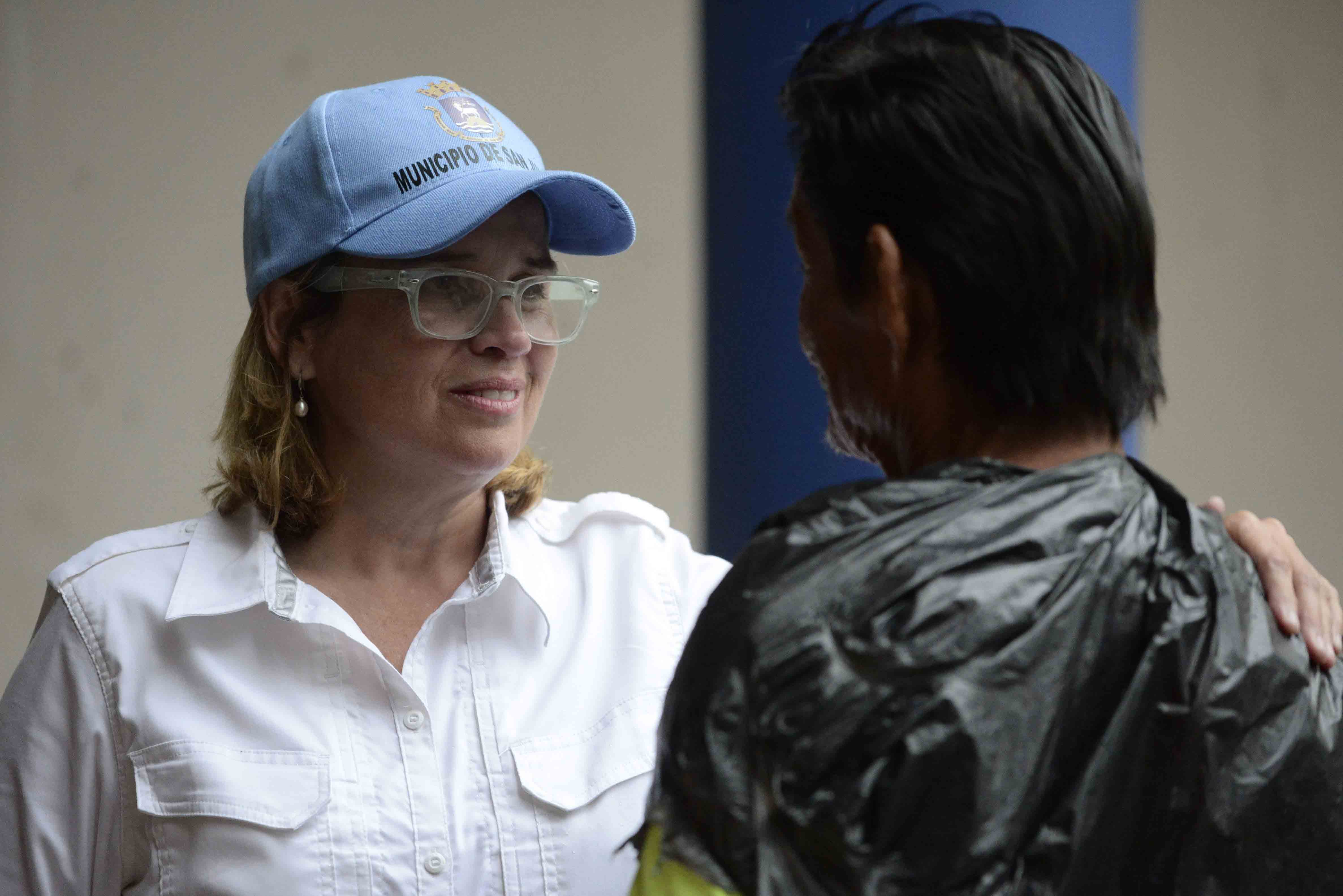 Mayor Carmen Yulin Cruz speaks with a man as she arrives at San Francisco hospital in the Rio Piedras area of San Juan, Puerto Rico, Saturday, Sept. 30, 2017, as about 35 patients are evacuated after the failure of an electrical plant. (AP Photo/Carlos Giusti)