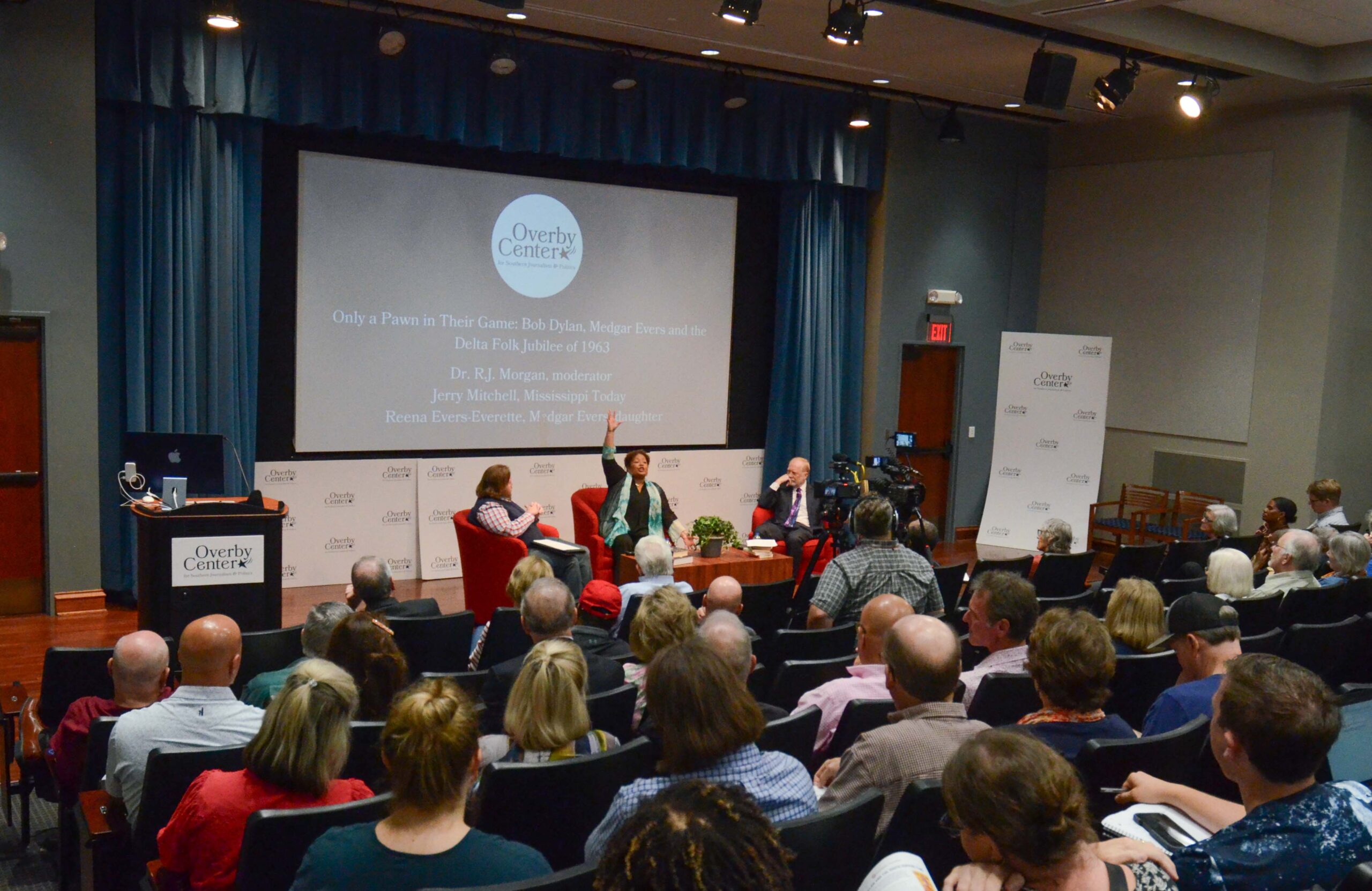 Reenva Evers-Everette, the daughter of Medgar Evers; R.J. Morgan; a University of Mississippi School of Journalism and New Media associate professor and instructor of JOUR 350: “Bob Dylan and the South and Jerry Mitchell, a Mississippi Today investigative reporter, discussed the legacy of Evers, Dylan’s songwriting and the connection between the two on Oct. 8 at the Overby Center at the University of Mississippi.
