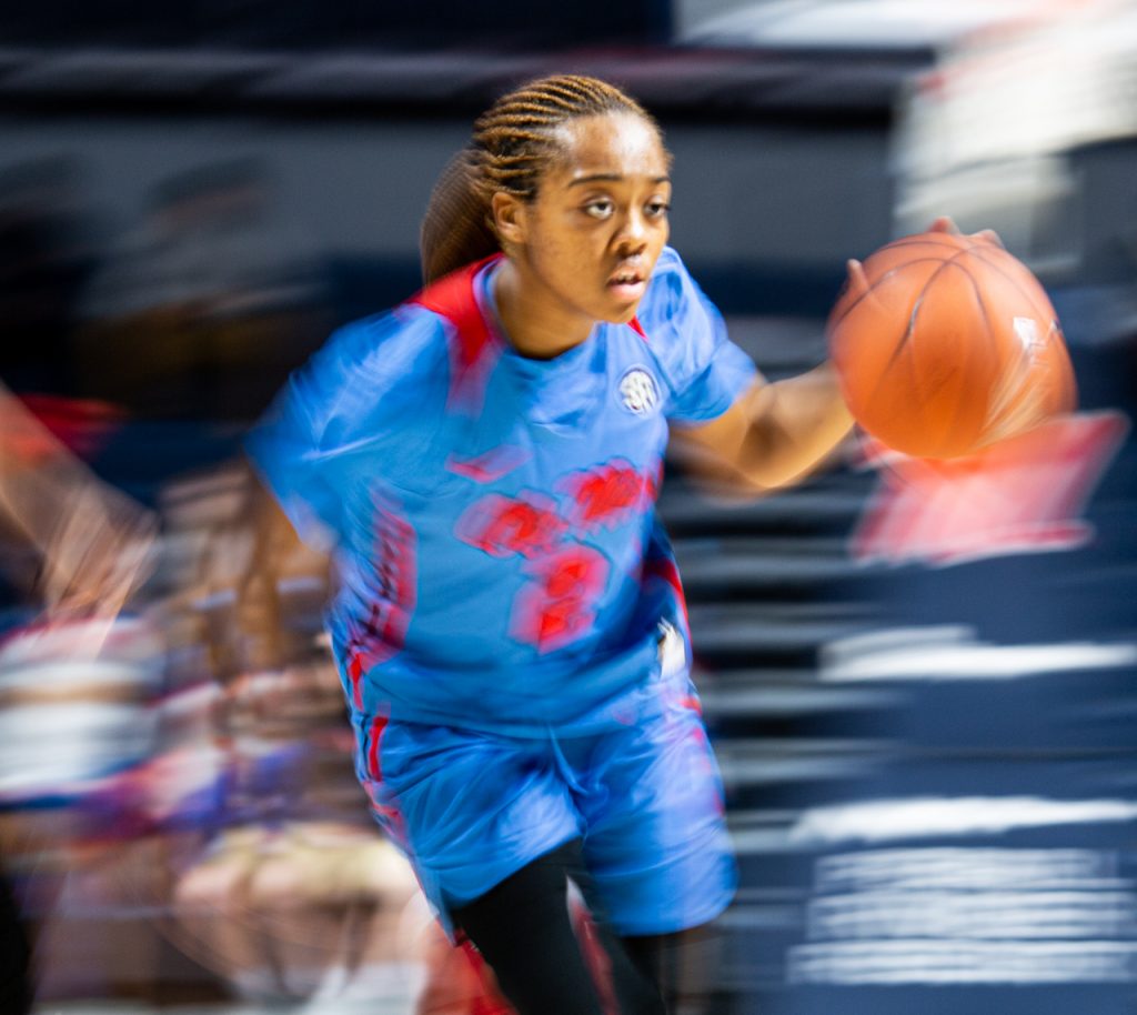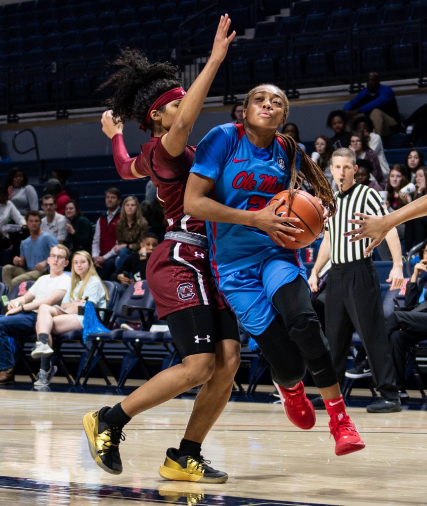 Mimi Reid drives towards the rim during the loss to South Carolina on Thursday in Oxford. Photo by Joshua Clayton.