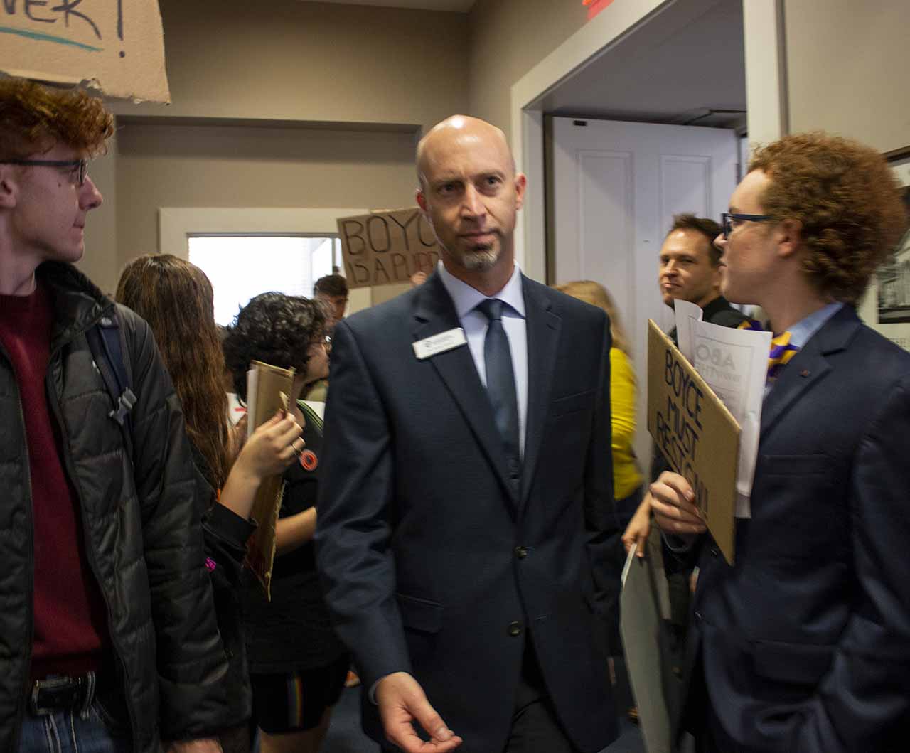 About 60 protesters chanted, “We have a voice, no Glenn Boyce” as they marched toward the Lyceum.