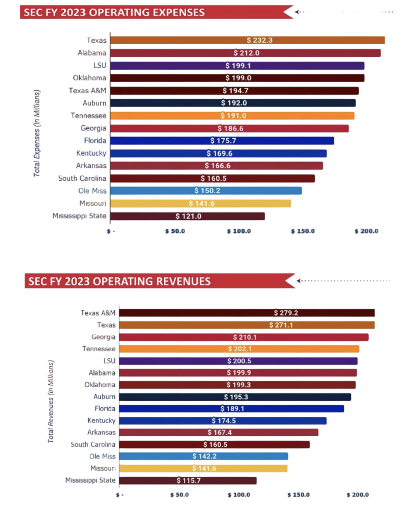 According to an Ole Miss Athletics press release, Ole Miss brought in $142.2 million total revenue during the 2023 fiscal year, while Texas A&M topped the conference with $279.2 million in total revenue.
