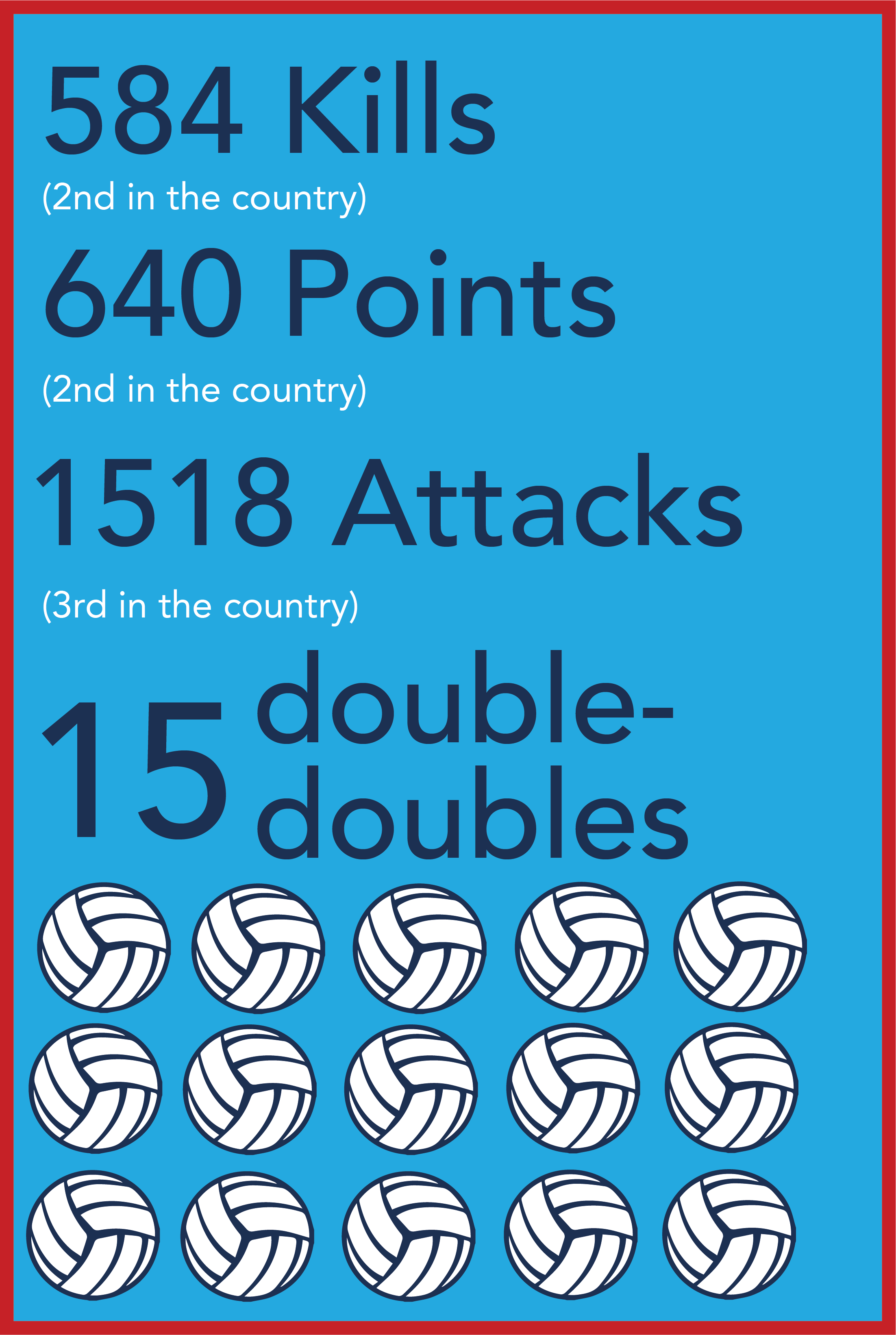 She has shattered school records and surged to the top of the leaderboards in nearly every possible attacking statistic. She finished second in the country in kills (583), second in points (639), third in attacks (1517) and top 10 in points and kills per set. She has fifteen double-doubles, and was selected to the All-SEC team following the season.