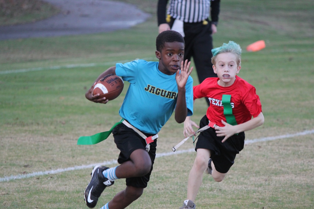Children play flag football at a game organized by the Oxford Park Commission at mTrade Park. Photo courtesy: John Davis, Oxford Park Commission