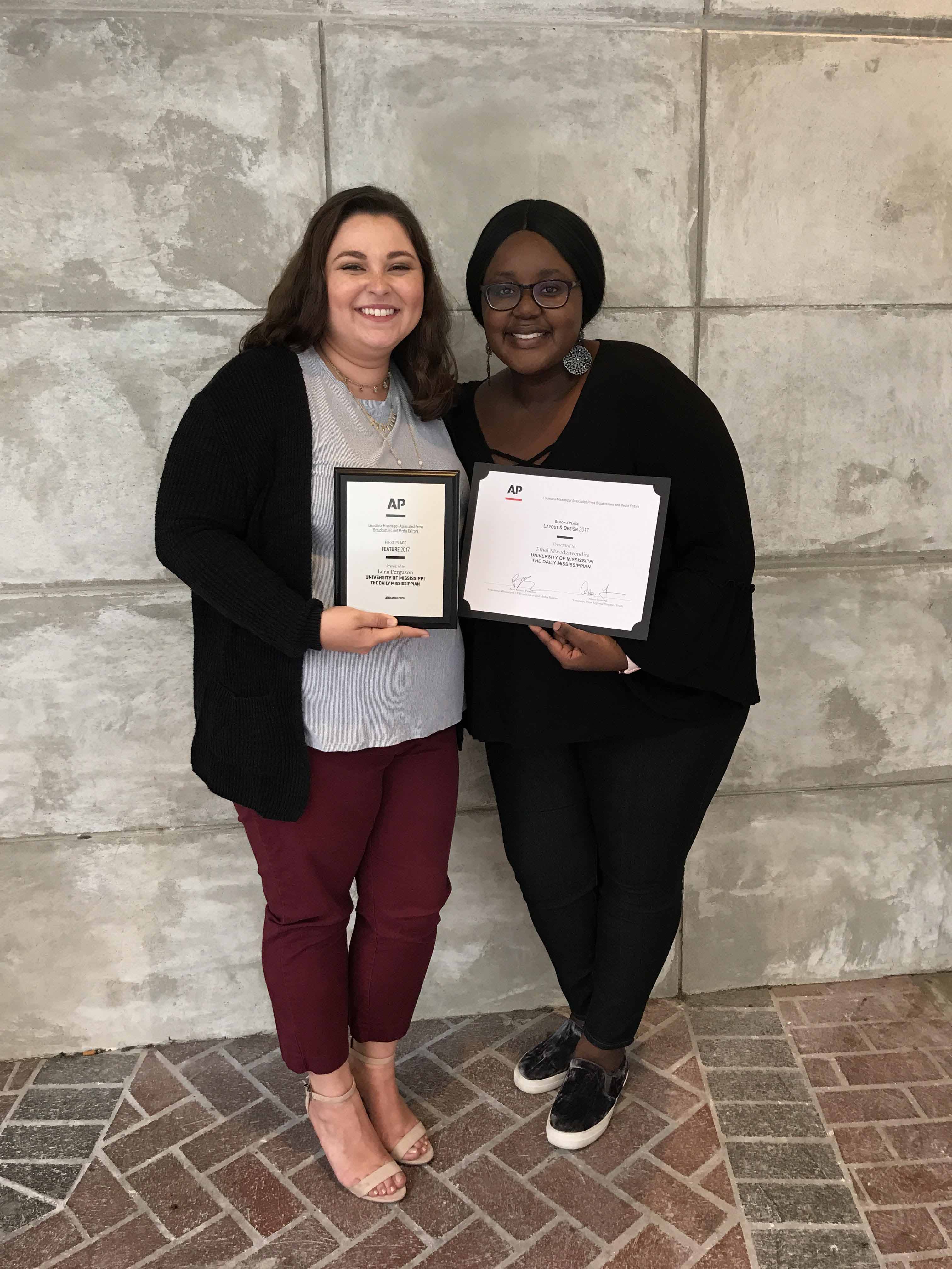 Lana Ferguson and Clara Turnage, for breaking news, for coverage of the arrest of a student for election sign vandalism; NewsWatch Ole Miss, for sportscast or sports program, for its live reports about NCAA sanctions; Abbie McIntosh and Marlee Crawford, in the documentary category, for a package about Orange, Texas, recovering from Hurricane Harvey; DeAndria Turner, in the radio sports category, for a recap of the Ole Miss versus LSU football game; and Italiana Anderson for radio news, for a package about the Hurricane Harvey relief effort.