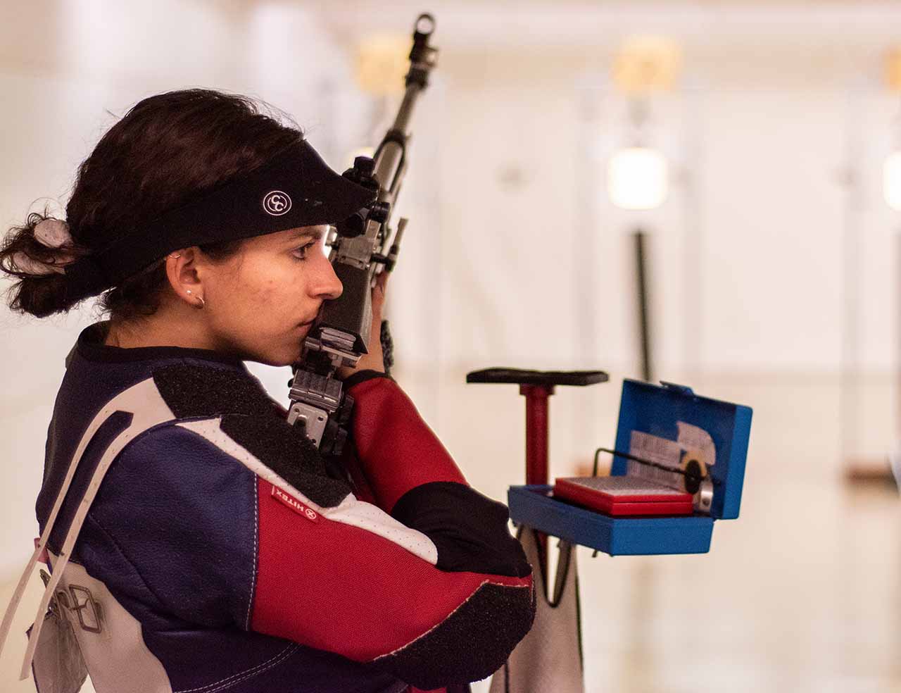An NCAA rifle match consists of one smallbore event and one air rifle event. Smallbore refers to athletes using a .22 caliber rifle at a 50 feet distance away from a target the size of a period at the end of a sentence. The shooter must fire 20 shots in each of three positions: kneeling, standing and prone (to lie flat). Shooters can fire at their own pace, however there’s a time limit of 1 hour and 45 minutes.