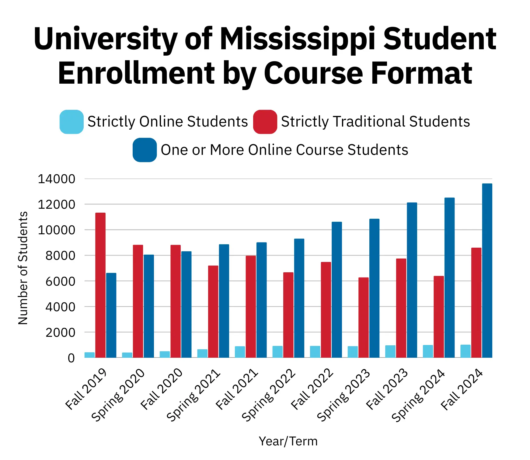 Student course preferences at the University of Mississippi have shifted since the fall of 2019. More students now favor hybrid schedules — a combination of in-person and online courses — over strictly traditional, in-person only formats.