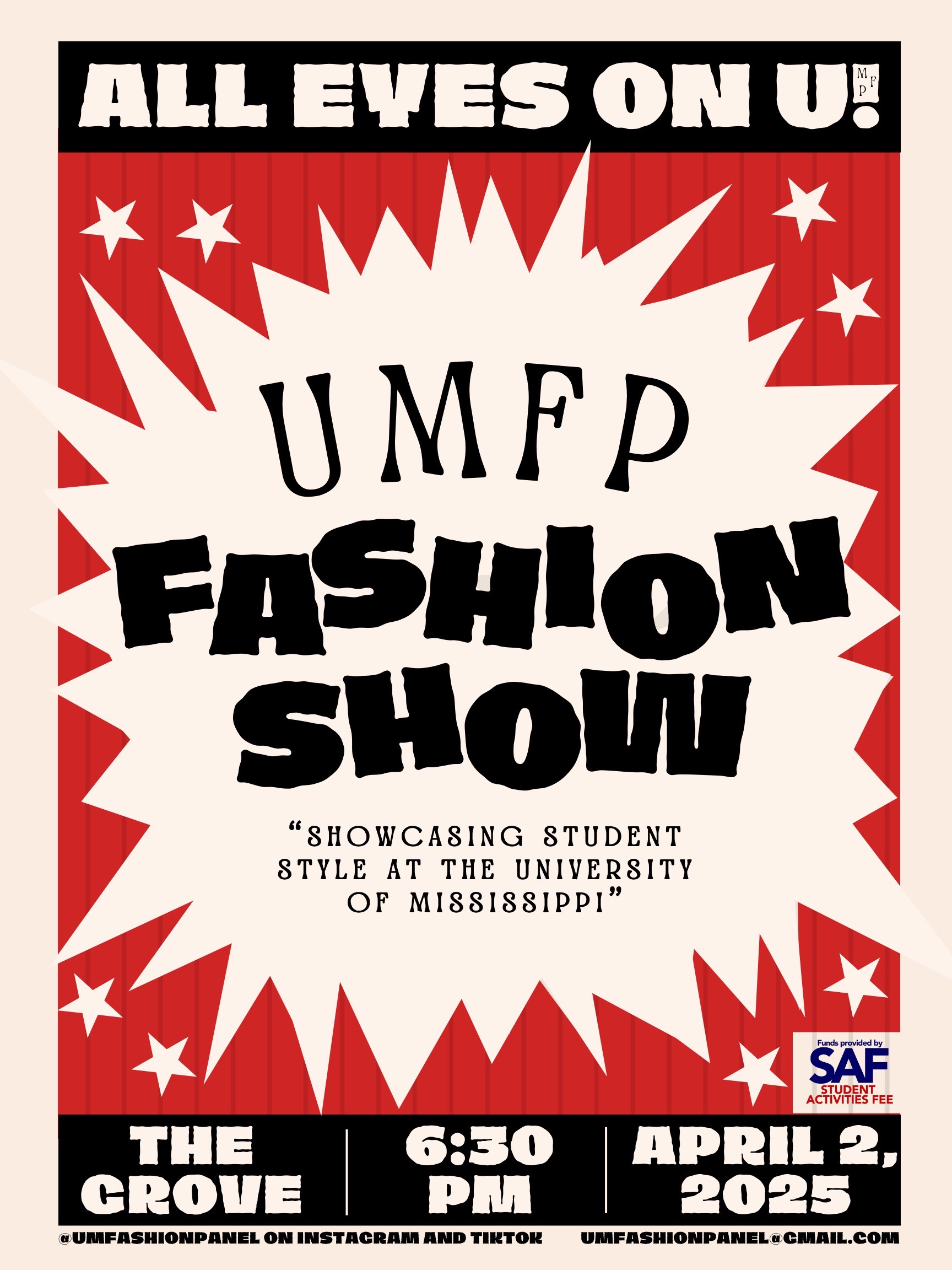 The runway is “Ole Miss” themed with models showcasing “game day,” “nightlife” and “going to class” outfits. Out of about 65 students who filled out the model call form on the organization’s website, 23 models were chosen to participate in the show.