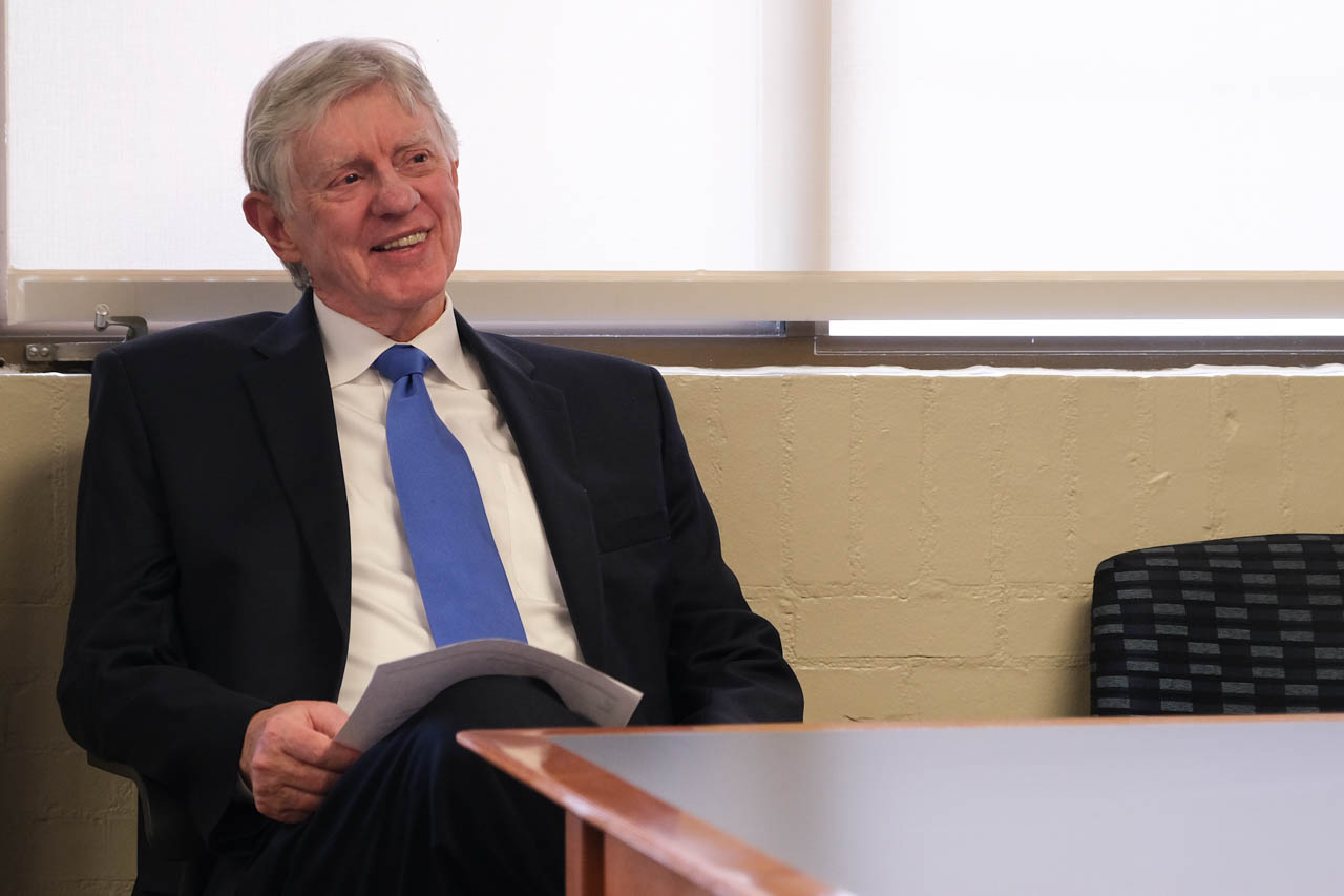 John W. Winkle III smiles as one of his former students speaks at the dedication of the John Winkle Reading Room in the Sally McDonnell Barksdale Honors College on Oct. 14, 2022. Photo by HG Biggs.