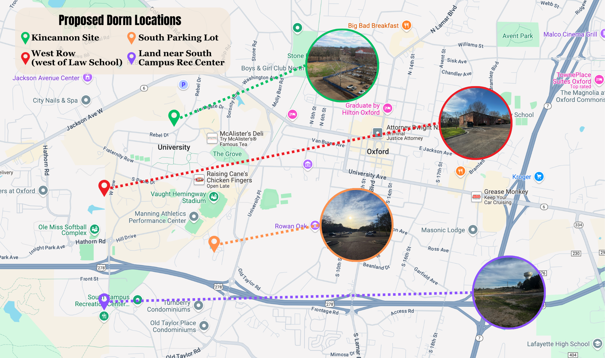 According to a university request for proposals (RFP) obtained by The Daily Mississippian, the new plan still includes the construction of student housing at the former Kincannon site but adds student housing projects in the following locations: a currently undeveloped site next to West Row near the UM School of Law, the current South Parking Lot on Athletics Lane and another site next to the South Campus Recreation Center.