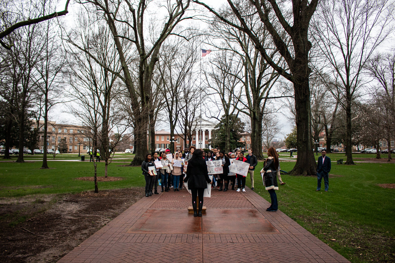 Escorted by police officers and university officials, dozens of university students marched from Lamar Hall to the Confederate monument in the Circle on Monday evening to commemorate Black History Month.