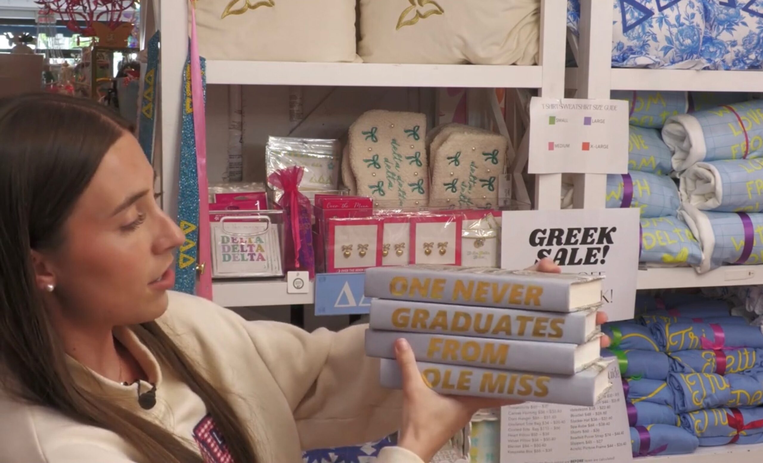 “One of our best sellers right now, it’s a bookstack that we have, and it says, ‘One never graduates from Ole Miss,’ which is one of the university’s sayings; everyone knows it,” Rogers said.